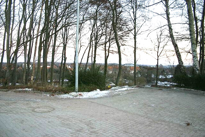 Blick aus halber Turmhöhe auf den Parkplatz. Zu erkennen ist, dass der Standort sich auf einer Anhöhe befindet...