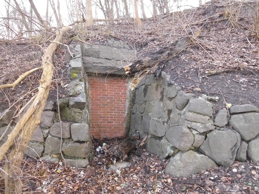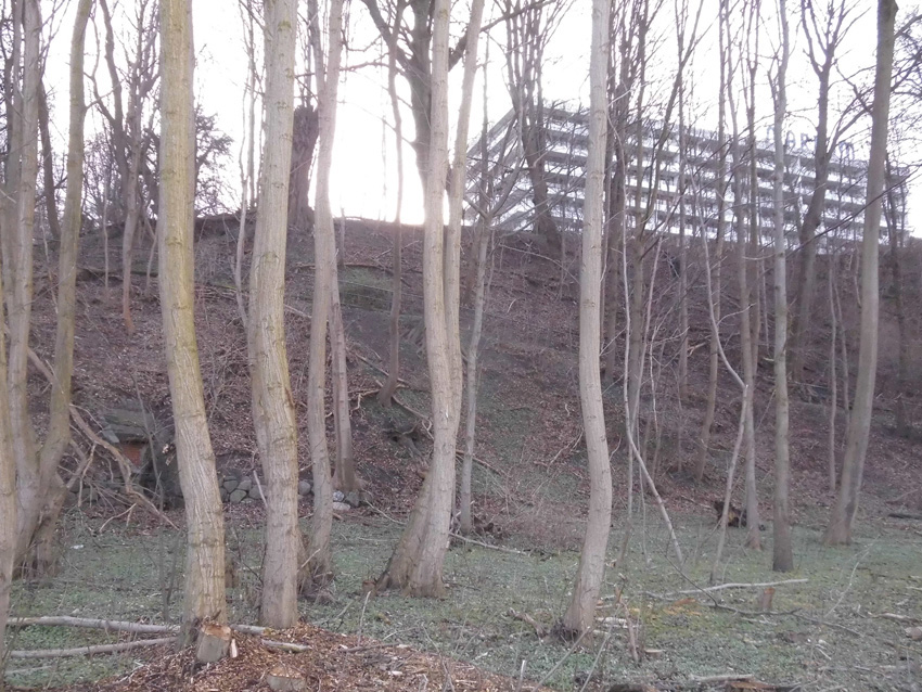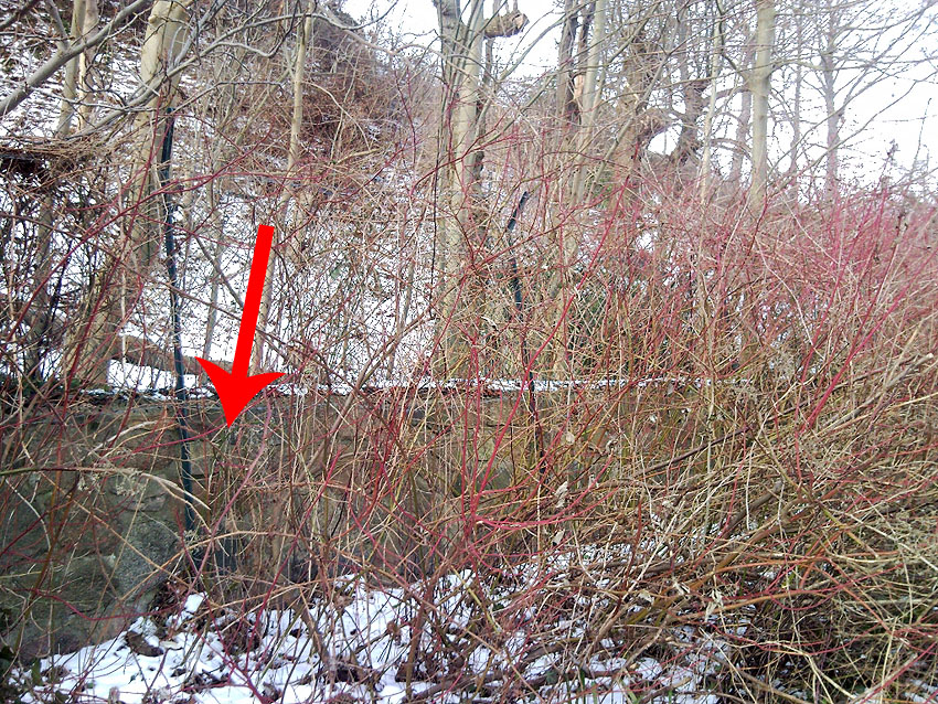 LS-Hangstollen Bellevue, eventuell mit zwei Eingängen, von denen auch der zweite mutmaßlich einige Meter weiter noch existiert (Bild mit Pfeil).