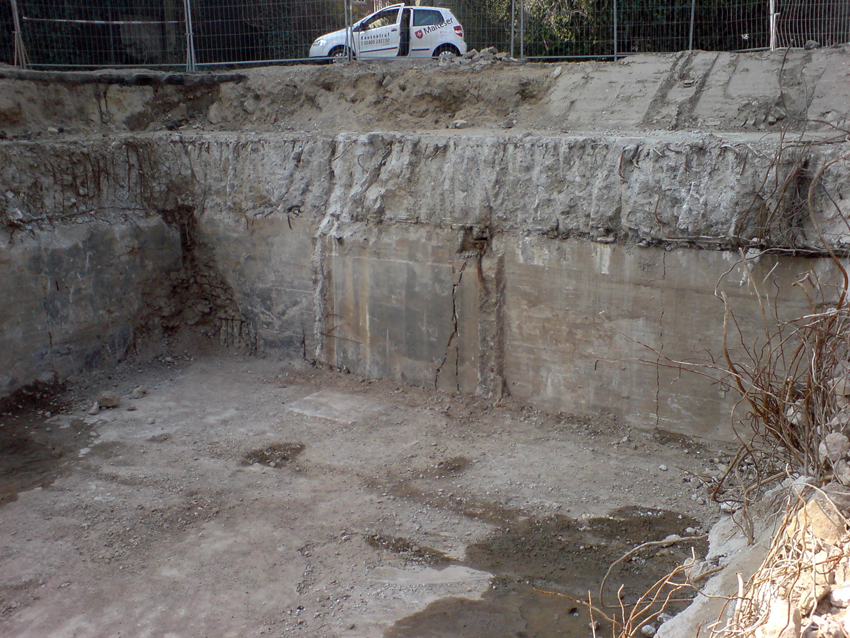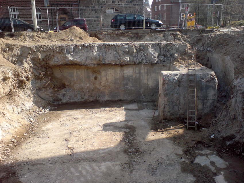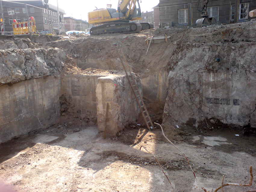 Freilegung eines Bunkerfundamentes im Straßendreieck Königsweg, Hummelwiese und Sachaustraße im März 2010. Es handelt sich hierbei mit ziemlicher Sicherheit um das Fundament / Keller des so genannten "Hummel-Bunkers", eines ehemals sechsgeschossigen Hochbunkers (inklusive einem Kellergeschoss).