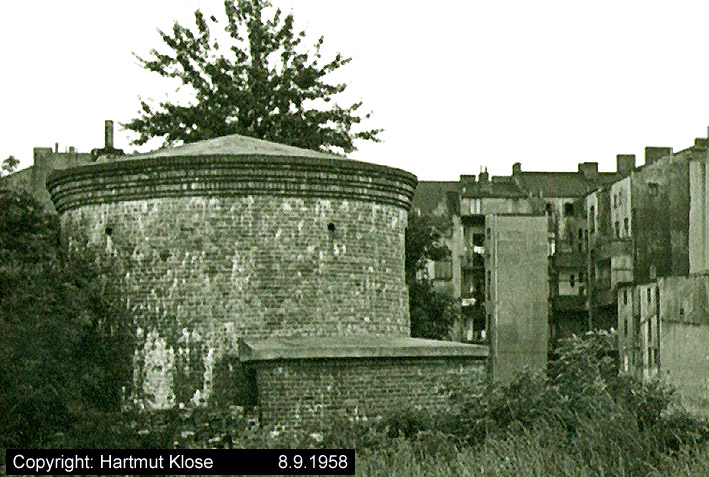 Aufnahme des verklinkerten kleinen Rundturmes an der Börsenstraße. Der Bunker wurde für den dortigen Parkhausneubau beseitigt. Aufnahme aus dem Jahre 1958.