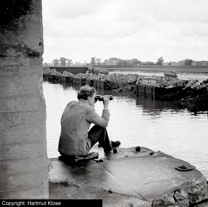 Aufnahme der nicht fertig gestellten "Neuen Hafentorschleuse". Mittig erkennbar ist der Bedienungsbunker. Im Hintergrund rechts zu sehen ist der Luftschutzturm der Bauart Dietel an der damaligen Ostfriesenstraße. Der Bedienungsbunker wie auch die Reste der Schleuse sind noch heute vorhanden. Aufnahme aus den 1950er Jahren.