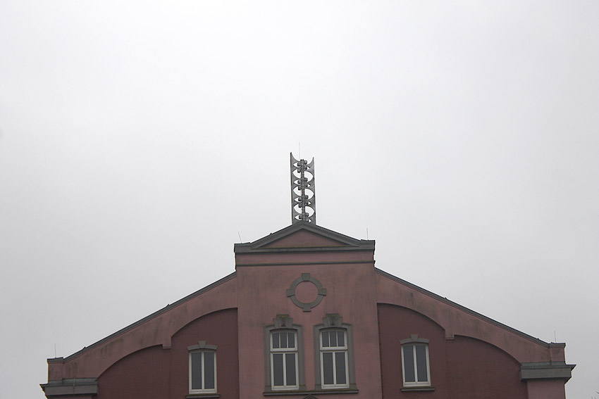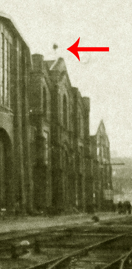 *Sollte die vorherige Sirene nicht existiert haben, ist klar, warum sie auf alten Aufnahmen nicht erkennbar ist, welche die Haupthalle aus Norden zeigen. Die "vorhandene Halterung" ist dann demzufolge auch keine Sirenenhalterung.