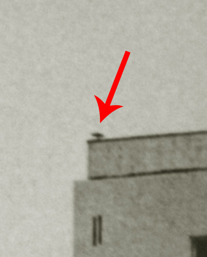 Oben im Bild rechts der Aufbau. Unten im Bild erkennbar wahrscheinlich die innere Sirenenhalterung im Dachstuhl, die noch bis zum Abriss des Gebäudes vorhanden gewesen sein dürfte.
