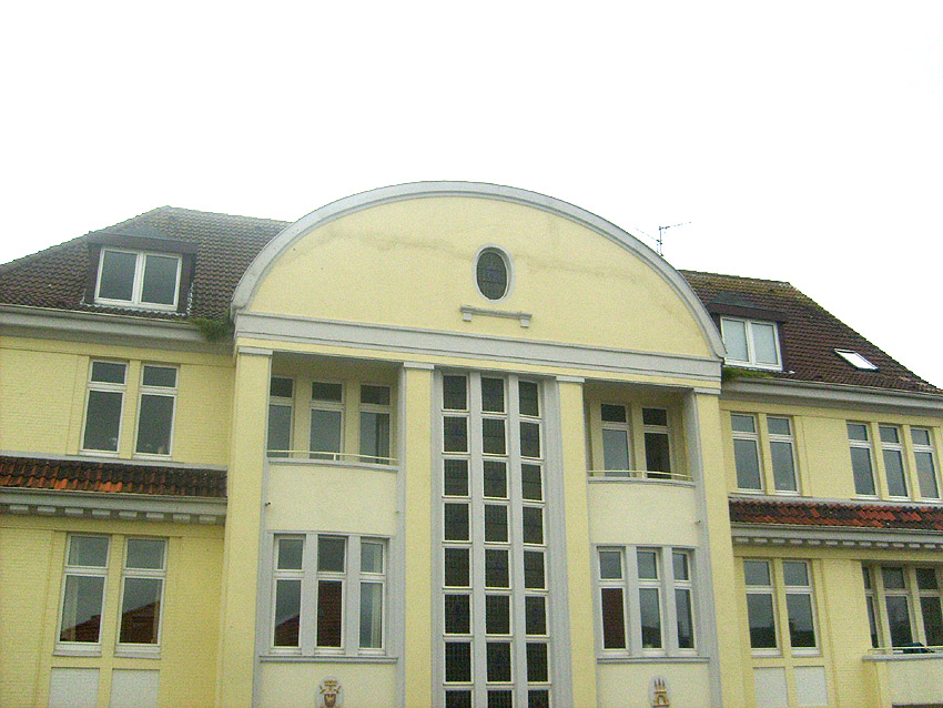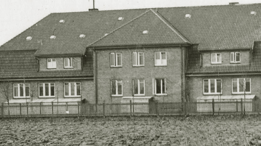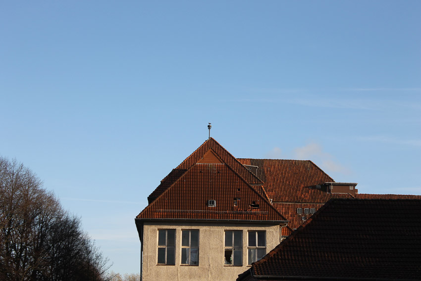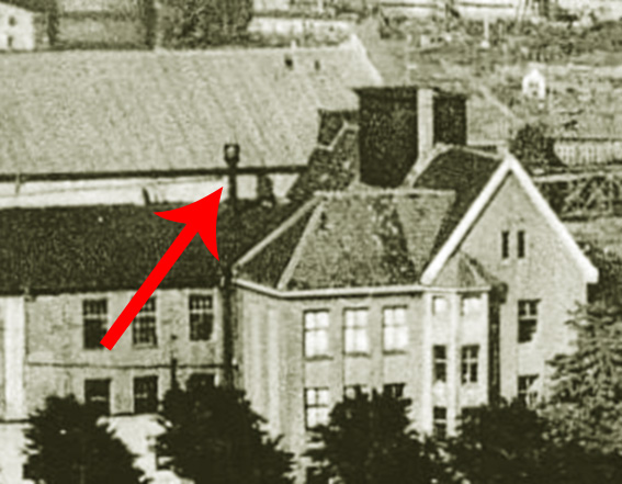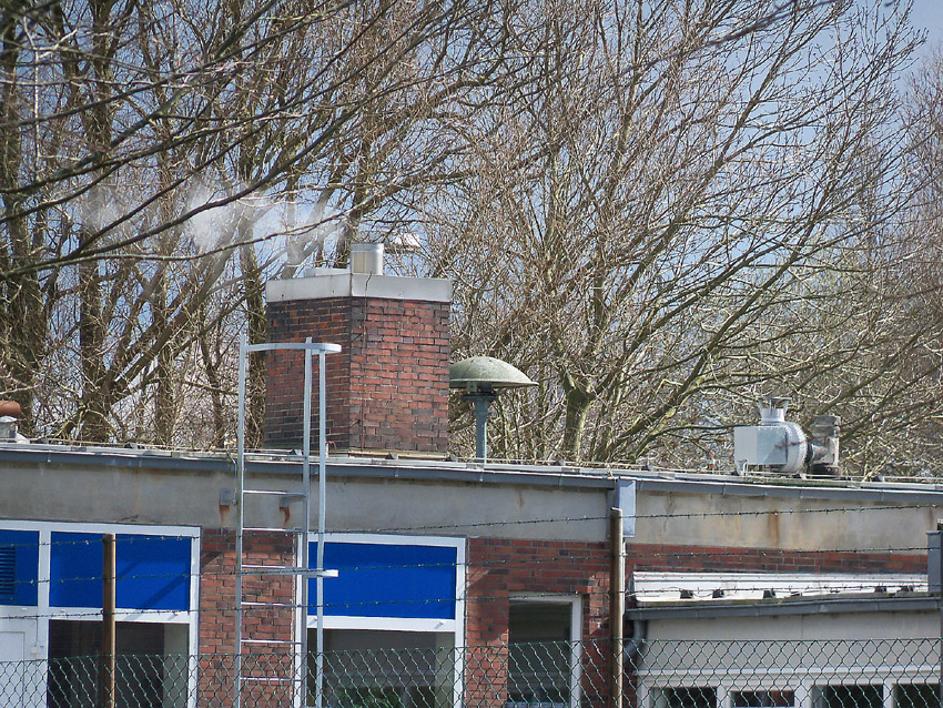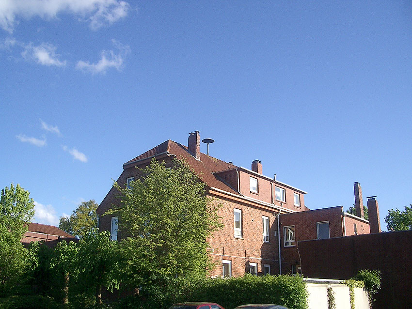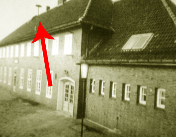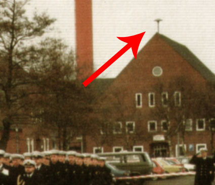 64. Kein Foto: Wohl Sirene aus dem WK 2 (wohl Zweifachsirene) auf dem Dach des historischen Gebäudes der heutigen Marineanlage Bordum (zur damaligen Zeit "Max-Planck-Institut für Zellbiologie") / hier neu montiert / Anbringung 1960er Jahre / wohl 1980er Jahre Entfernt