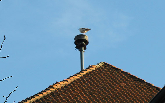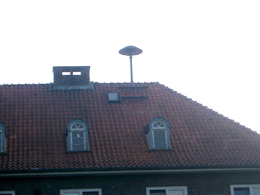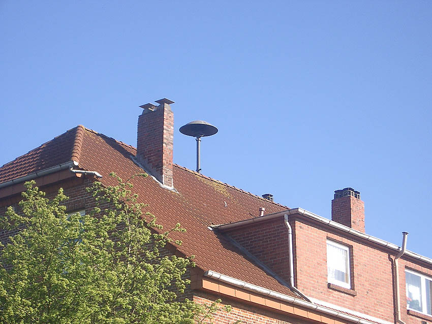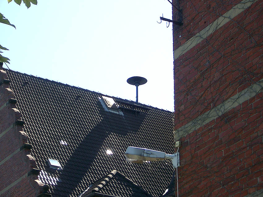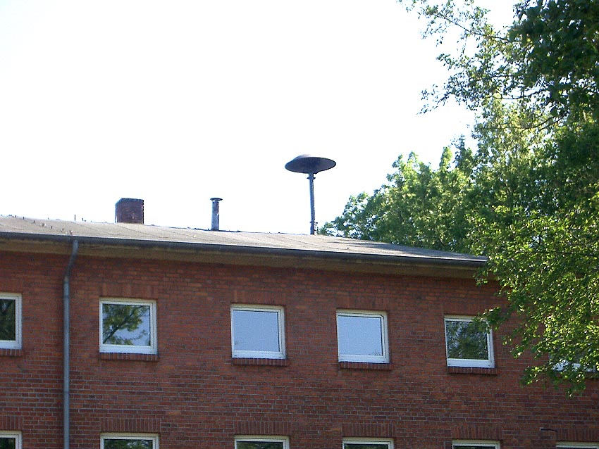 16. Sehr wahrscheinlich Sirene (Einheitssirene E57) mit Halterung aus dem WK 2 auf dem Dach eines Mehrparteienwohnhauses am Europaring / hier neu montiert Vorhanden