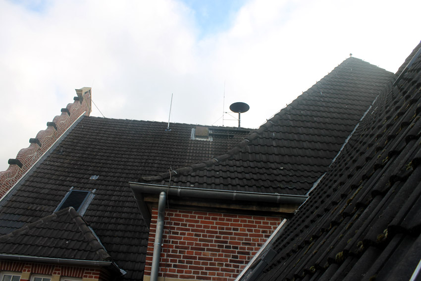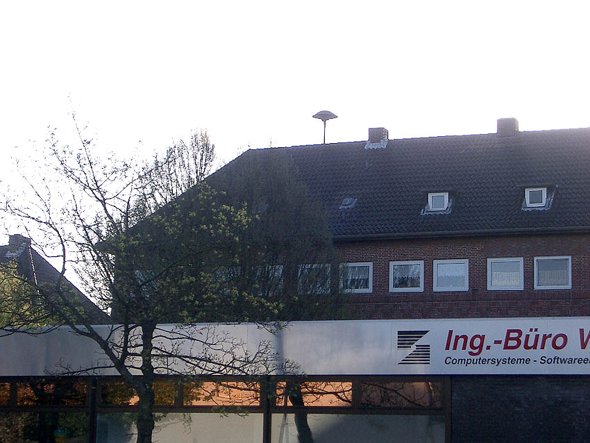 78. Sirene (eventuell Einheitssirene E57) auf dem Dach des Gebäudes Emsstraße 1 / Montierungszeitraum unklar / wohl 1980er Jahre Entfernt / Sirenenhalterung im Westbereich der Giebelspitzenkante vom Gebäude vorhanden