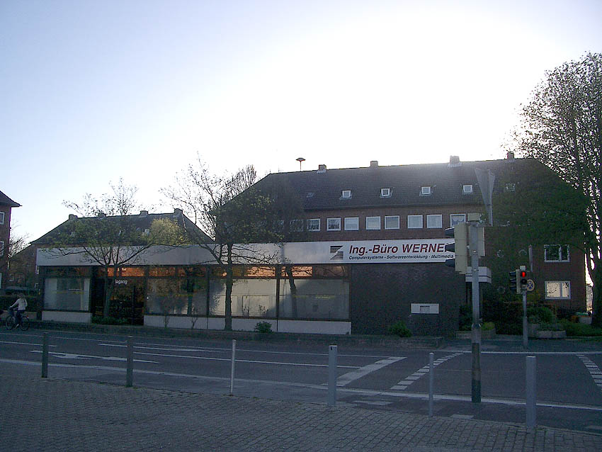81. Kein Foto: Sirene aus dem WK 2 (Zweifachsirene) auf dem Dach des Gebäudes Werftstraße Höhe Mündung Rheinstraße / südlich / am Banter Markt / Originalstandort / 1949 noch vorhanden gewesen (Bild mit Sirene aus dem Jahr 1949 liegt vor) / wohl 1950er Jahre Entfernt