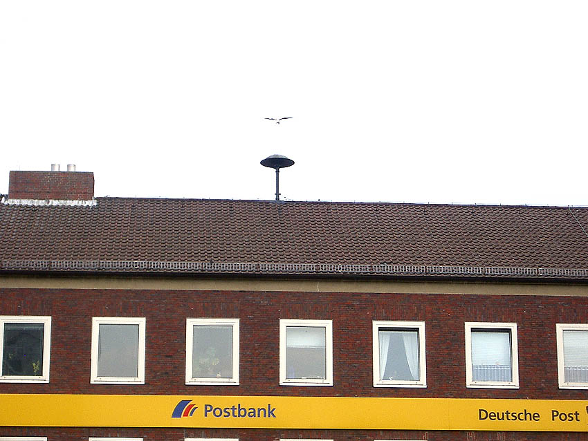 91. Kein Foto: Nachkriegs-Sirene (Einheitssirene E57) auf dem Dach des Gebäudes direkt neben dem Dorfladen Poststraße 38 in Fedderwarden (ehemaliges Gemeindebüro im Gebäude / Dorfladen wurde später angebaut) / eventuell Originalstandort von Ursprungssirene / wohl 1980er Jahre Entfernt / Sirene war 1964 nachweisbar noch existent