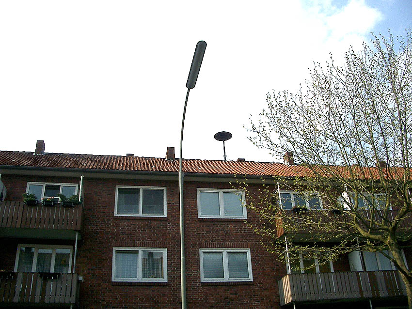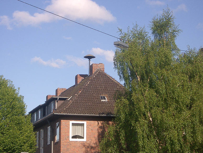 ?. Kein Foto: Nachkriegs-Sirene (?) (Einheitssirene E57) mit hohem Mast auf dem Dach eines Gebäudes ungefähr im Bereich Lahnstraße-Süd / hier neu montiert (?) Entfernt