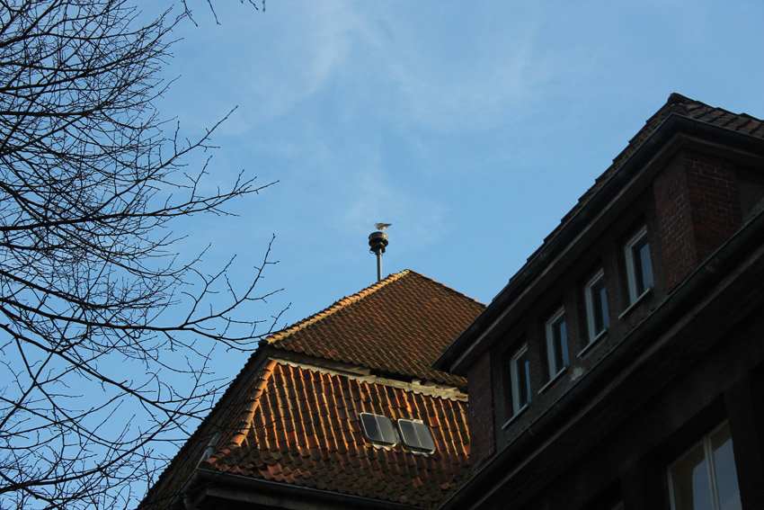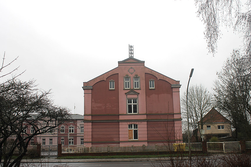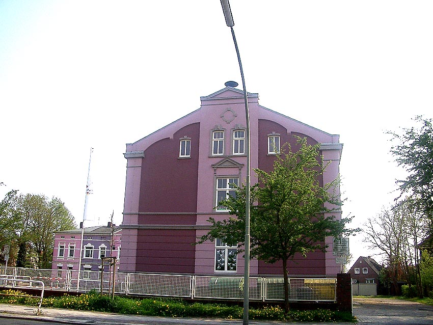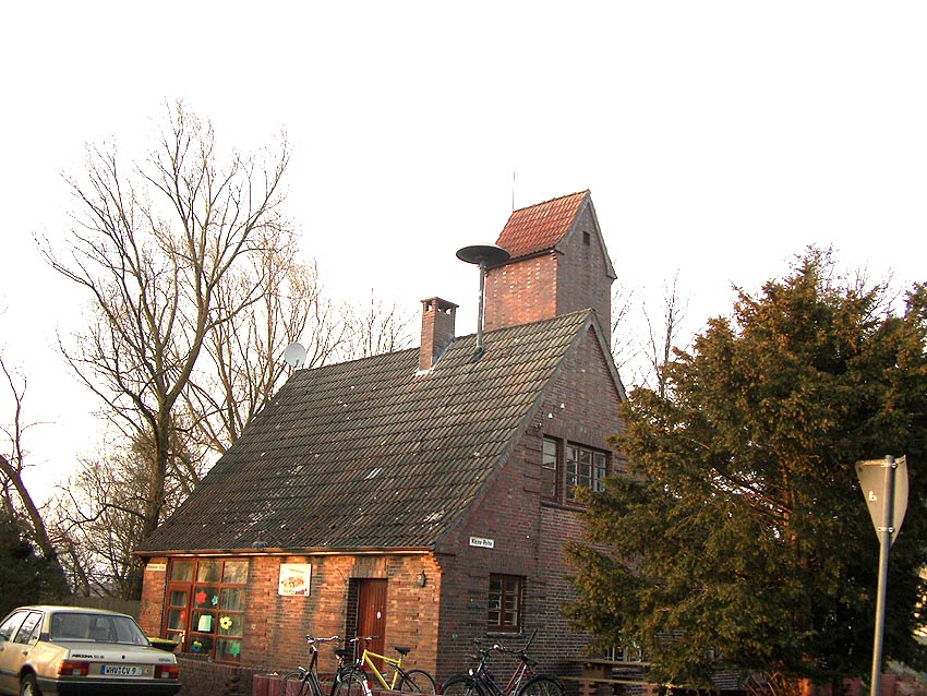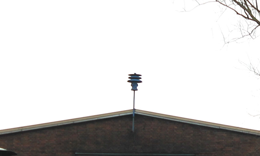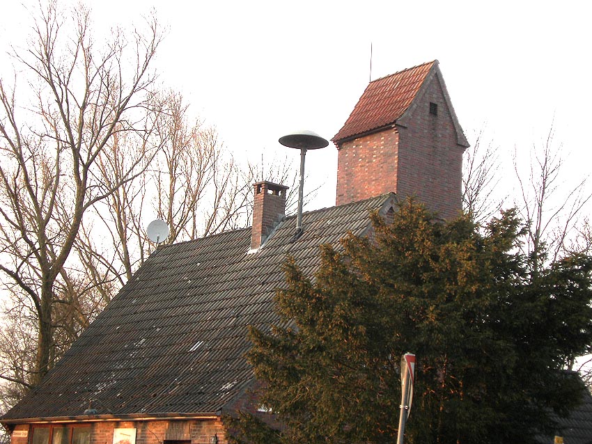 59. Nachkriegs-Sirene (Einheitssirene E57) auf dem Dach der ehemaligen Schule Antonslust (ursprünglich Außengebäude der Marine-Nachrichtenstelle Langewerth / eventuell Originalstandort von Ursprungssirene / wohl 1980er Jahre Entfernt / Sirenenhalterung im Mittelbereich der Giebelspitzenkante vom Gebäude vorhanden / eventuell Ursprungs-Sirenenhalterung