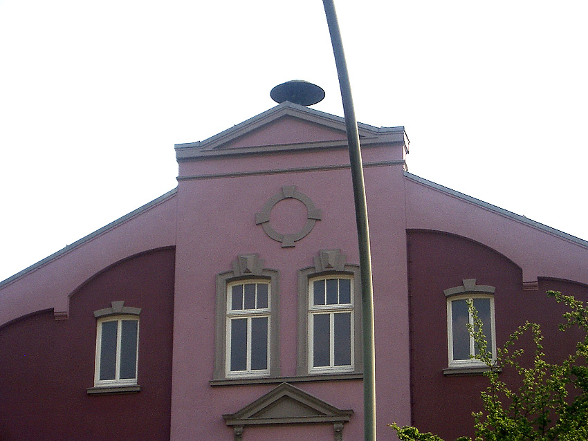 In den 1980er Jahren befand sich die Sirene direkt auf der Giebelspitze des erhöhten Daches des Gebäudeteils hier rechts vom jetzigen Standort. Die Halterung befand sich am erkennbaren hellen Bereich an der Giebelspitze. Wann die Sirene ummontiert wurde, ist unklar. - Zudem befand sich in dem Bereich im Krieg eine Sirene anderer Bauart. Siehe dazu Position 89.