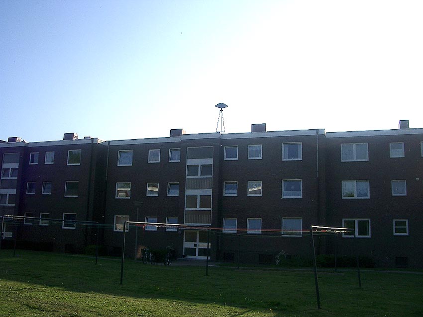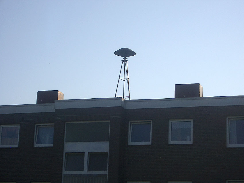 73. Kein Foto: Nachkriegs-Sirene (Einheitssirene E57) auf dem Dach eines Mehrparteienwohnhauses an der Beethovenstraße Höhe Mündung Regerstraße / Altengroden-Süd / hier neu montiert / wohl 1980er Jahre Entfernt