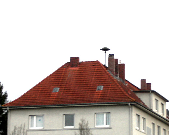 ?. Kein Foto: Nachkriegs-Sirene (Einheitssirene E57) auf dem Dach eines der großen Mehrparteienwohnhäuser unmittelbar südlich des Luftschutzturmes Bentinckstraße / hier neu montiert (?) Entfernt
