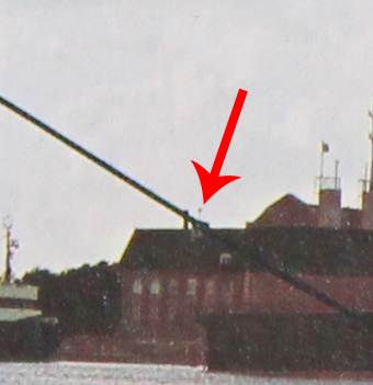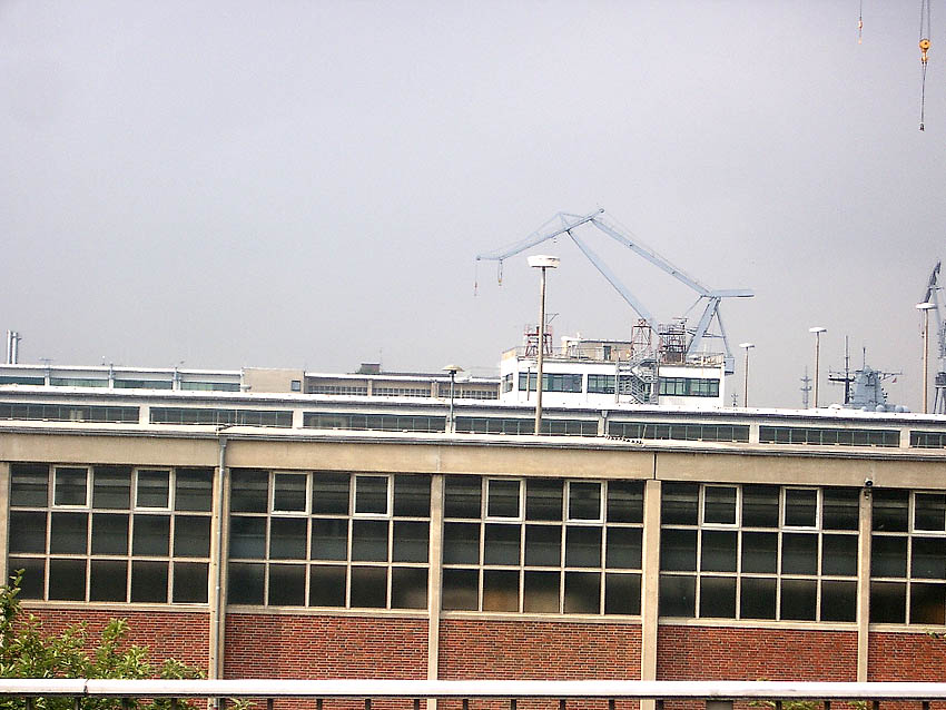 93. Kein Foto: Nachkriegs-Sirene (Einheitssirene E57) mit hoher Dreifachmast-Halterung auf dem Dach (nahe südliche Dachkante) des Kommandogebäudes an der Endrasstraße im Marinestützpunkt / 4. Einfahrt / eigenständige Sirene der Bundeswehr für Stützpunktbereich / hier neu montiert / wohl 1990er Jahre Entfernt