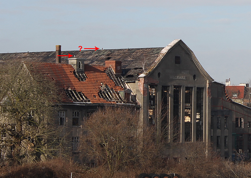 Mittlerweile wurde eine (weitere?) Sirene vom Typ E57 auf der Südzentrale, direkt auf dem Aufbau des Anbautraktes nachgewiesen. Sie befand sich dort bis mindestens 1995. Die Halterung ist noch heute auf dem Dach zu sehen (unterer Pfeil). Auf dem historischen Bild oben liegt die erkennbare Sirene scheinbar genau auf / über diesem Aufbau. Entweder gab es nur die eine Sirene, oder der Aufbau lag zufällig in einer Flucht mit der dahinter befindlichen Sirene auf der Haupthalle. Mittlerweile scheint es aber immer wahrscheinlicher, dass hier nie zwei Sirenen (zeitlich versetzt) existierten, sondern nur diese eine auf dem Nebengebäude: Der Aufbau, auf dem die Sirene montiert worden war, ist vormals in seiner Breite und Höhe erweitert gewesen. Hier hat sich der "leichte Flakstand Südzentrale" befunden, wofür im Krieg der Aufbau modifiziert worden ist. Als die E57-Sirene montiert wurde, war die Erweiterung des Aufbaues aber bereits wieder rückgebaut worden.