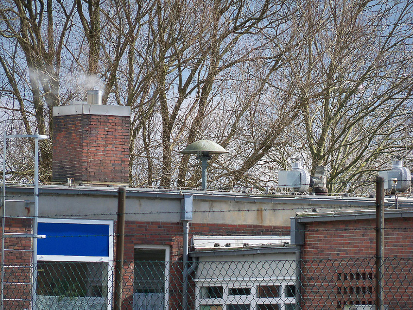 ?. Kein Foto: Nachkriegs-Sirene (Einheitssirene E57) auf dem Dach der Südzentrale / Aufbau Nebengebäude / eventuell Originalstandort von Ursprungssirene / wohl 1960er Jahre montiert / 1995 oder nach 1995 Entfernt / Nachkriegs-Sirenenhalterung auf dem Aufbau vom Nebengebäude vorhanden
