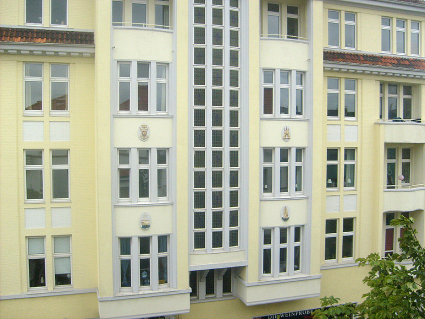 63. Kein Foto: Nachkriegs-Sirene (Einheitssirene E57) auf dem Dach des Wohngebäudes ("Bavariahaus") Rheinstraße Ecke Ahrstraße / eventuell Originalstandort von Ursprungssirene / wohl 1990er Jahre Entfernt / Sirenenhalterung eventuell im Mittelbereich der Giebelspitzenkante vom Gebäude vorhanden (auf den Fotos ist eventueller Standort nicht ersichtlich) / eventuell Ursprungs-Sirenenhalterung