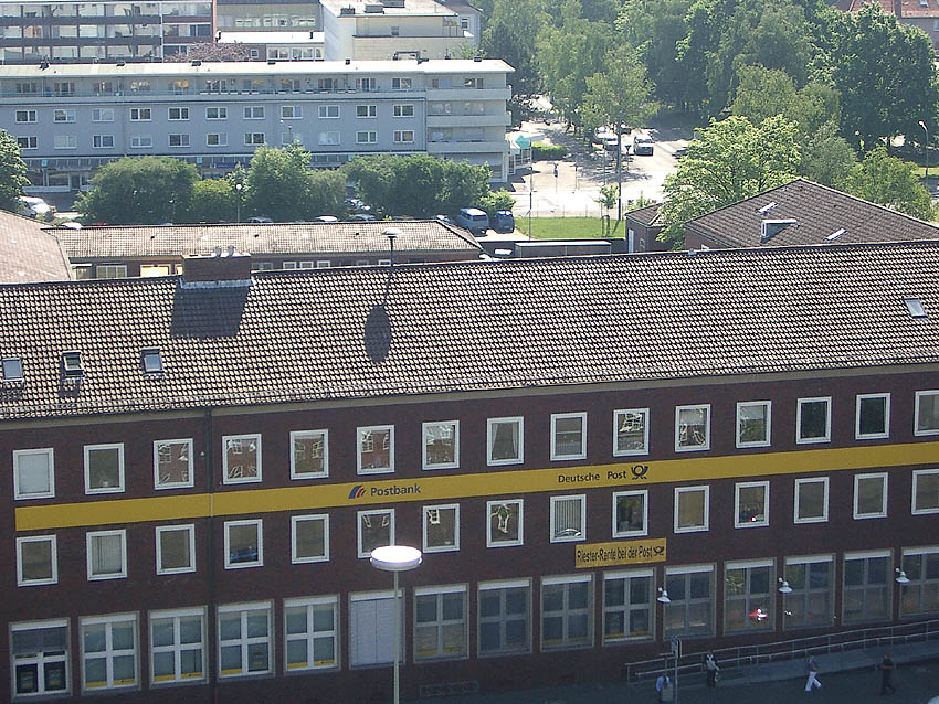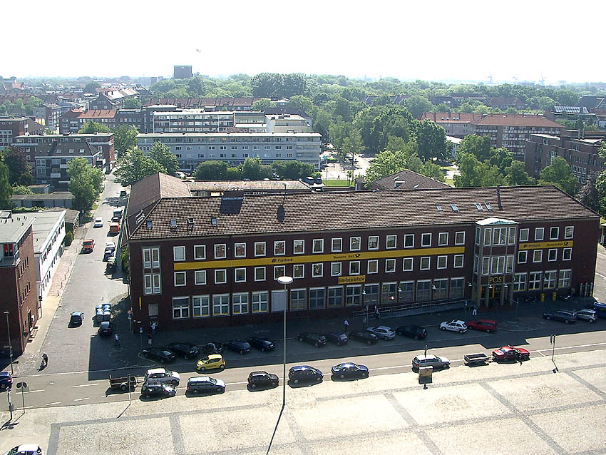 75. Kein Foto: Nachkriegs-Sirene (Einheitssirene E57) auf dem Dach des Mehrparteienwohngeschäftshochhauses an der Gökerstraße Ecke Bismarckstraße / Nordwestbereich / hier neu montiert / zunächst Dreifachhalterungsfuß / später Einfachhalterung / wohl 1980er Jahre Entfernt