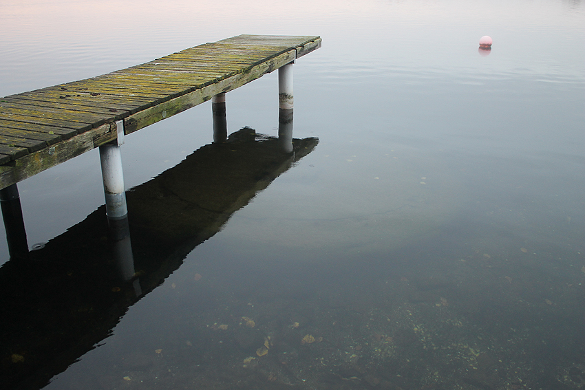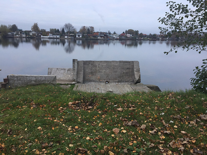 Mit zwei Schildern gekennzeichnete Untiefe im Süd-Mitte-Bereich vom Banter See. Die im Gittermuster erstellte Stahlbetonkonstruktion einer Schwerlast-Abladefläche für Schiffsfracht ist hier noch immer unmittelbar unter Wassergleiche in deren Ostbereich vorhanden. Ursprünglich erstreckte sie sich noch ein ganzes Stück weiter nach Westen. Sie befand sich genau an / in der ehemaligen Uferkante / bzw. Kais des damaligen Hafens. So sieht man heute, wie durch die späteren Demilitarisierungen die Uferkante weiter nach Süden gerückt ist. Fertig gestellt wurde die Abladefläche wohl nicht gänzlich, da sie zum Kriegsende noch immer keine Abschlussdecke erhalten zu haben schien. Der erhaltene Bereich der Konstruktion ist zudem nach Westen hin abgesackt, daher ist der Ostbereich näher and der Wasseroberfläche und vor allem auf Luftbildern gut erkennbar. Die Konstruktion wurde nach Kriegsende teilgesprengt. Etwas weiter nördlich davon: