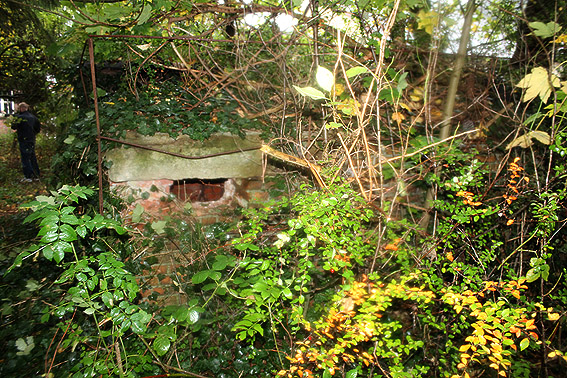Emsstraße: Östlich des ehemaligen Gebäudes, an welches der dortige ebenfalls abgerissene Bunker westlich angesetzt war, befinden sich noch immer eine Betonplatte und eine Stahlklappe. Was war das? Ein Brunnen? Eine Verbunkerung?