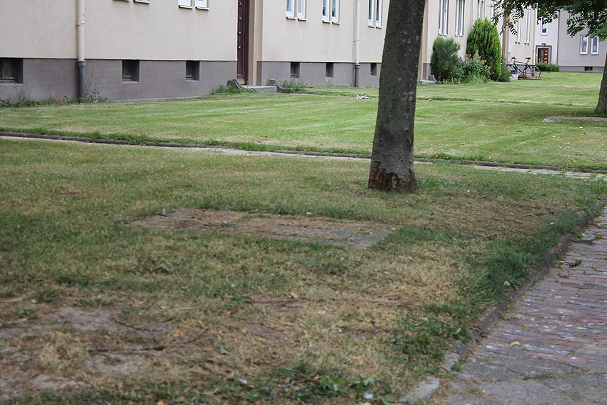 An drei Vorkriegs-Mehrparteienhäusern an der Schillerstraße (Nr. 60 / 62 / 64 / 66 / 68 / 70) befinden sich ca. 5 Meter vom Gebäude entfernt insgesamt sechs dieser Öffnungen, mittlerweile versiegelt. Was war das? Für Zisternen wohl zu groß. Eventuell Schächte von LS-Kellern / externe Notausstiege? Kennt jemand so etwas? Auch an anderen Stellen in der Stadt sind solche Verdachtsobjekte existent (gewesen). Die Objekte werden auf unseren Seiten ebenfalls vorgestellt. Selten wurden sie sogar als "Ausstiegs-Kriechtunnel" nachgewiesen. Der Anwohner, den wir hier an der Schillerstraße getroffen haben, wusste leider "von nichts". "Tunnel" vom Keller aus soll es hier nicht (mehr?) geben... Im ganzen Stadtgebiet finden sich - vornehmlich an Gebäuden, die ab 1935 im Zuge des reichsweiten Luftschutzgesetzes LS-gerecht ausgestattet wurden, solche Öffnungen. Hier - Beispiel Weichselstraße in Fedderwardergroden (1941):