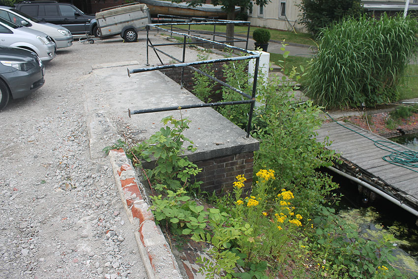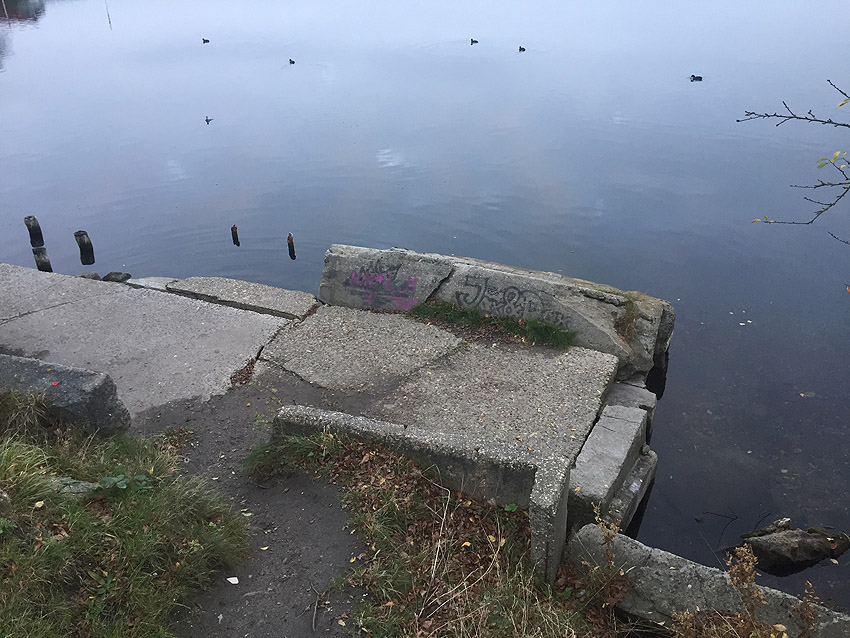 Westlich des Objektes befindet sich dieser Mauerwerksfortsatz am Uferbereich... Im Nordwestbereich der Wiesbadenbrücke befindet sich am dortigen kleinen Seglerhafen dieses massive Mauerwerksblock-Objekt mit Betondecke direkt am Ufer. Bis zum Frühjahr 2018 befand sich hier fast direkt westlich anliegend ein Gebäude, welches im Zuge der Umgestaltung der Wiesbadenbrücke (geplante Neubauten) abgerissen wurde. Es bestand schon 1945 (bzw. eher). Nach dem Krieg wurde in den Bereich des Objektes ein Schuppen gebaut. Auf 1945er Luftbildern ist das Objekt erkennbar mit länglicher Fortsetzung nach Süden hin auf die Wiesbadenbrücke. Bisher war uns dieser Block durch das Gebäude (bzw. den Schuppen) nicht aufgefallen. Was war das? Eine Verbunkerung aus dem Zweiten Weltkrieg? Das westlich davon befindliche Gebäude besaß einen Keller. Bestand hier ein Zusammenhang? Im Block befindet sich eine mit Glasbausteinen verschlossene Öffnung. Ein Notausstieg bzw. Eingang direkt am Wasser würde jedoch wenig Sinn machen.