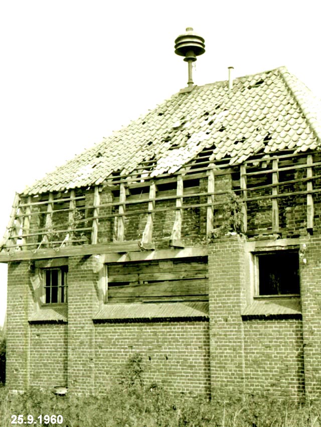 Dies war das ehemalige Pumpwerk / Trinkwasser-Zisterne am Anton-Dohrn-Weg. Noch heute befindet sich dort eine mit Kleingärten überbaute, erhöhte, rechteckige Fläche. Einige Betonwandbereiche sind zu erkennen. Wie auf dem oberen Bild aus der frühen Nachkriegszeit zu sehen ist, verfügte die Anlage über zwei massive Eingangsbauten mit Flankenschutz an der Nordseite, westlich und östlich. Eventuell bestanden die Bauten aus Beton. Auf der Erhöhung zu sehen vertikale Luftschächte. Auf der Erhöhung das ehemalige Pumpwerksgebäude mit WK 2-Sirene. War diese Anlage verbunkert, beziehungsweise - diente sie sogar als Behelfs-Personenluftschutzraum? Das Gebäude stand auf einer noch heute vorhandenen Erhebung, darunter befand sich eine Trinkwasser-Zisterne: