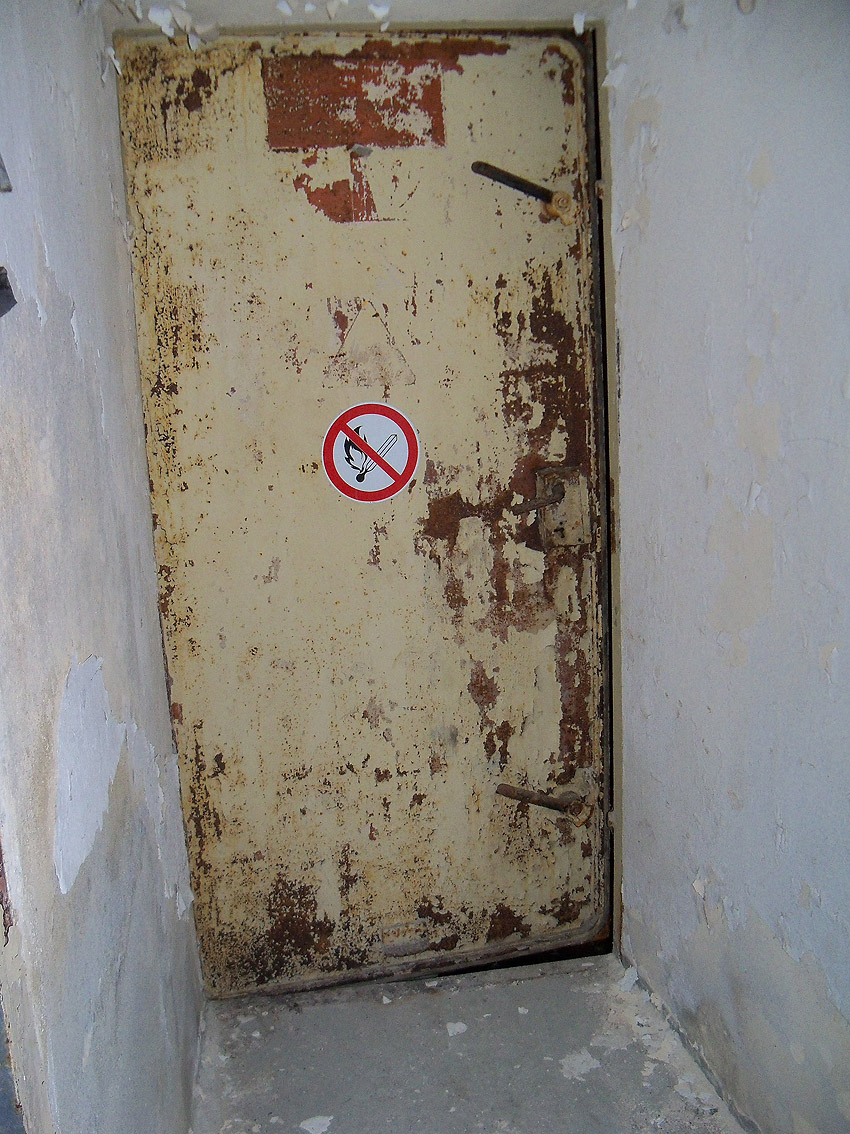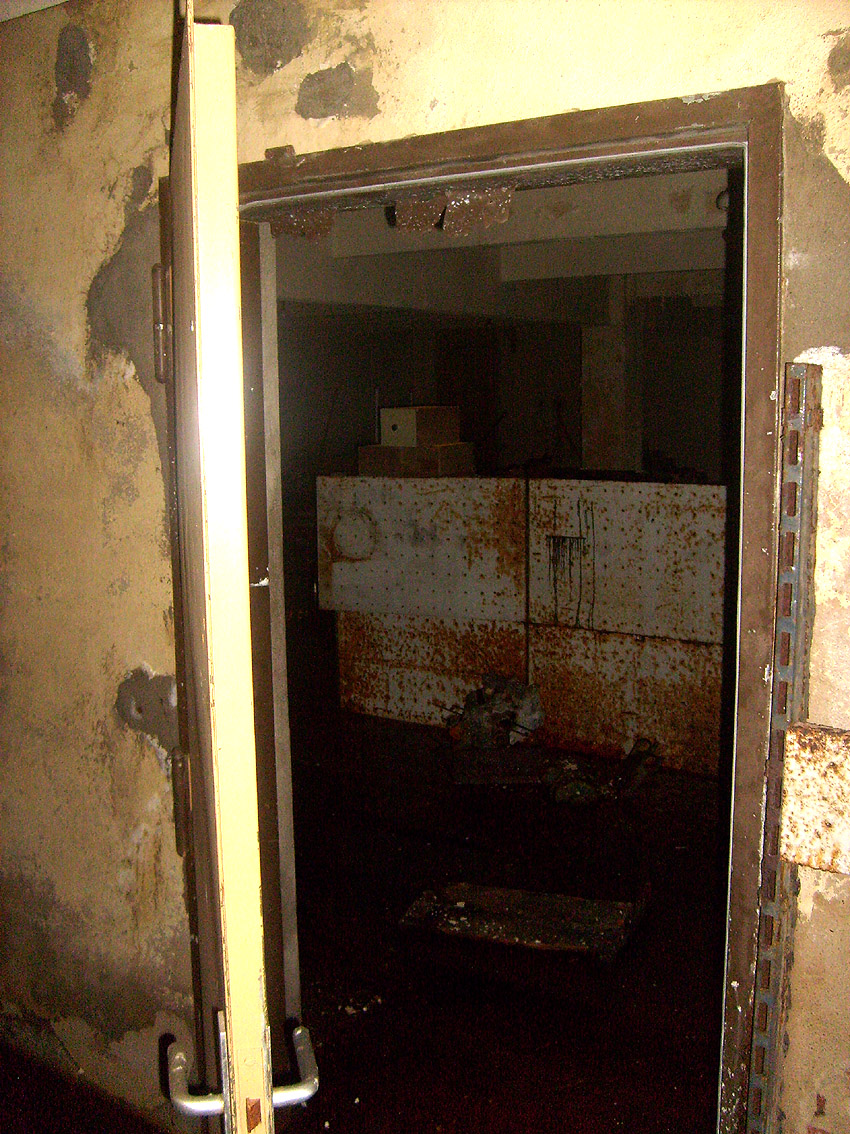 Blick durch die oben erkennbare rückwärtige Tür in den dortigen nach links verlaufenden Vorkeller und den ehemaligen LS-Raum selbst. Dort im Hintergrund links ist wiederum der oben abgebildete Hauptzugang erkennbar: