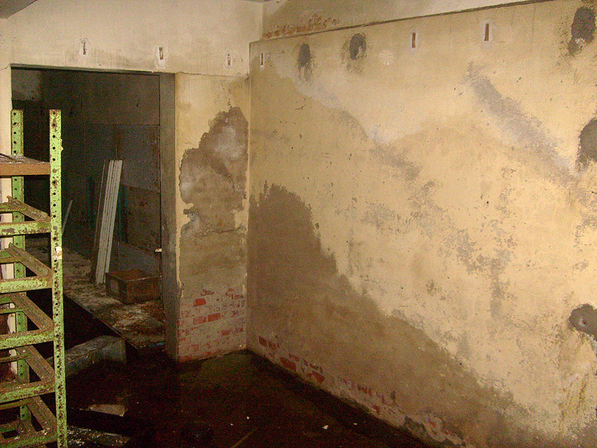 Beachtlich sind die beiden mit Beton umkleideten / verstärkten Stahlträgersäulen. Diese Maßnahme geschah, um dem Raum weitere Stabilität zu verleihen. Hinten links befindet sich der zweite, rückwärtige Eingang in den Keller. Dies wird der ehemalige Notausgang gewesen sein. Er führt fast direkt in das Erdgeschoss des Wohntraktes / Bürotraktes. Dort sind allerdings keinerlei LS-Spuren (mehr) erkennbar...