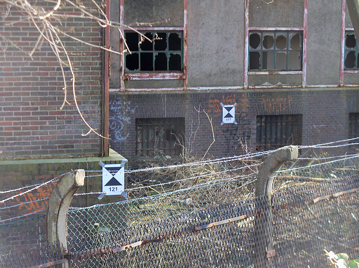 Vermessungsmarken rings um das Gebäude für das in Auftrag gegebene neuerliche Gutachten