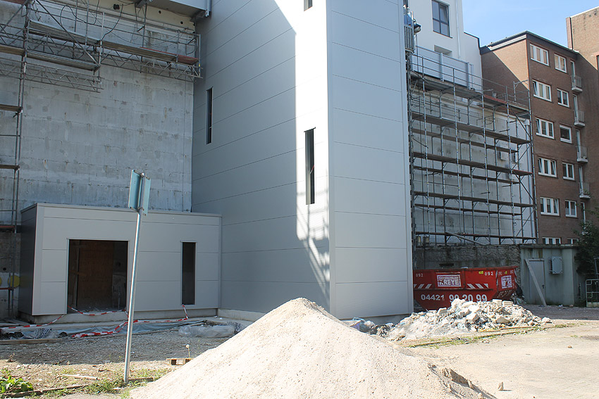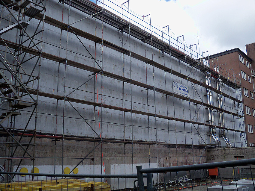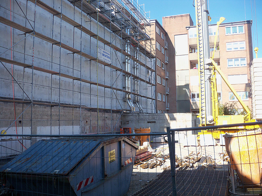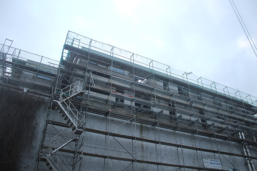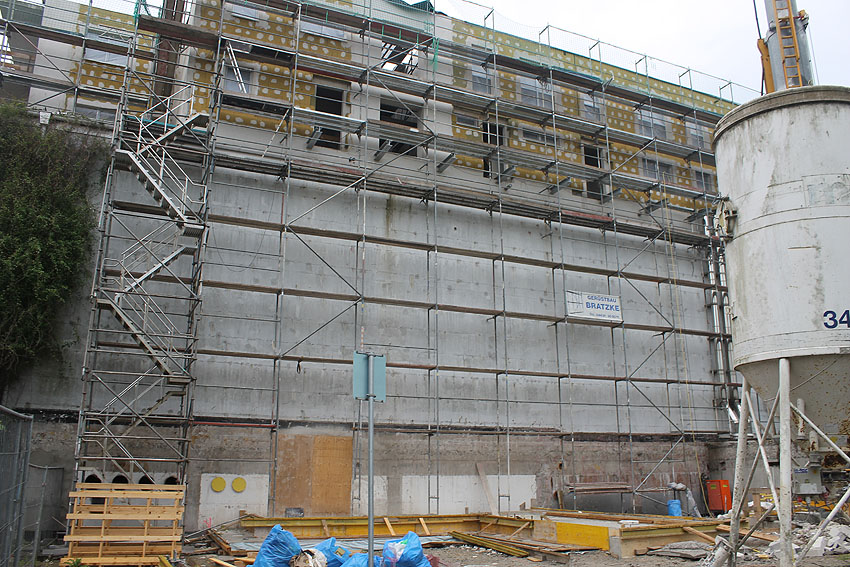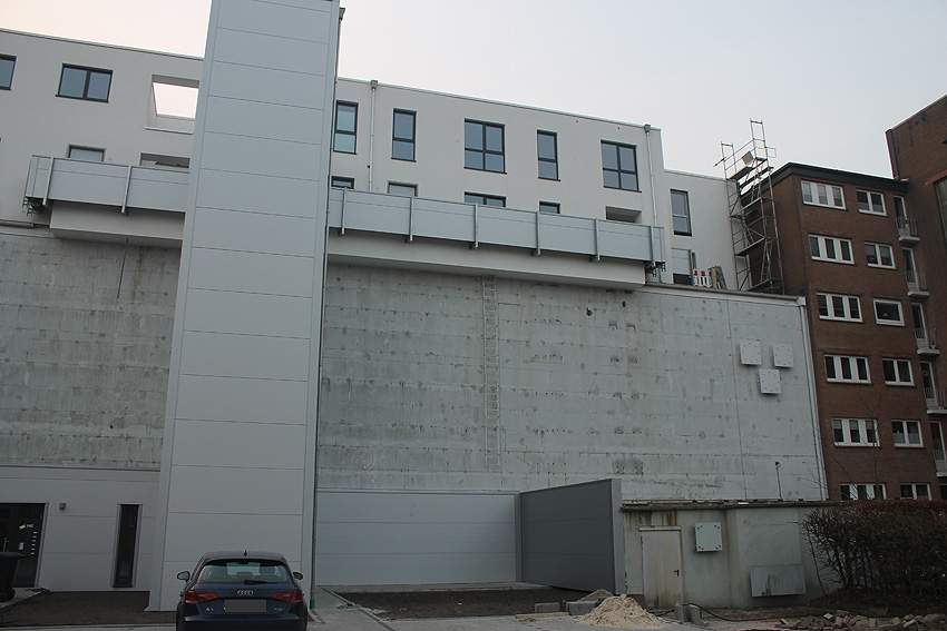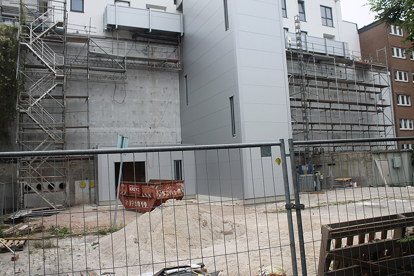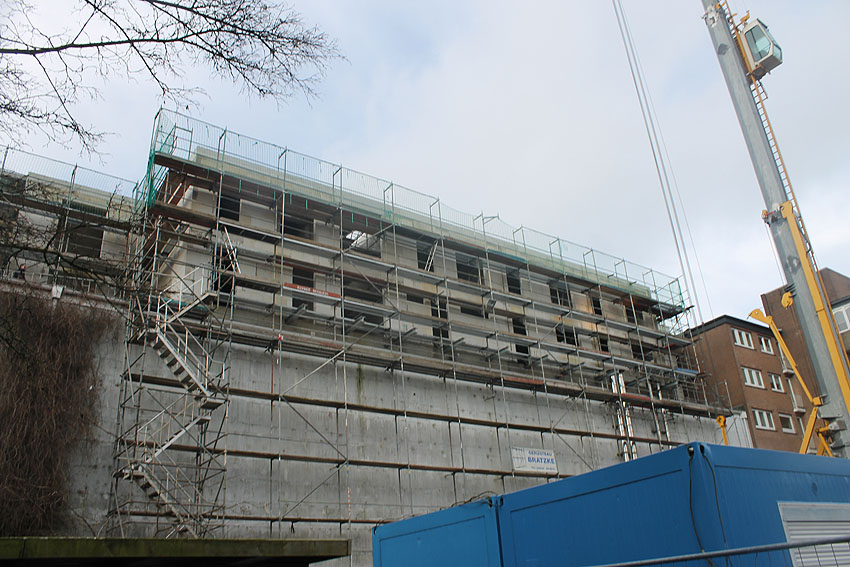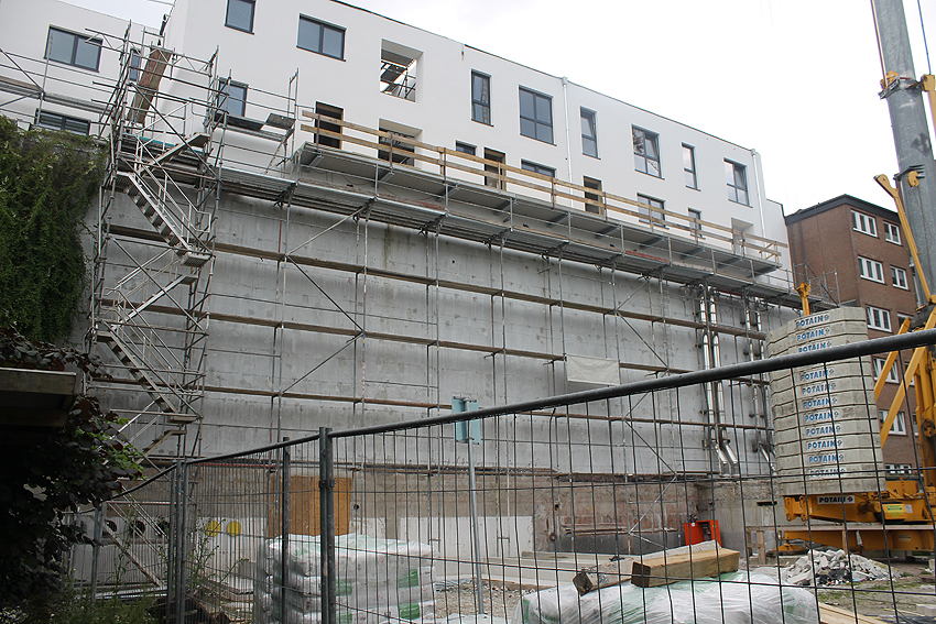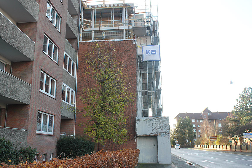 Am ehemaligen OP-Bunker Virchowstraße wird nun an der rückwärtigen Ostwand der Treppenhaus- und Fahrstuhlanbau für die aufgebauten Wohnungen errichtet. Wo genau der Fahrstuhl installiert wird, ist uns allerdings noch etwas unklar. Die Arbeiten gehen stetig weiter ihrer Vollendung entgegen.