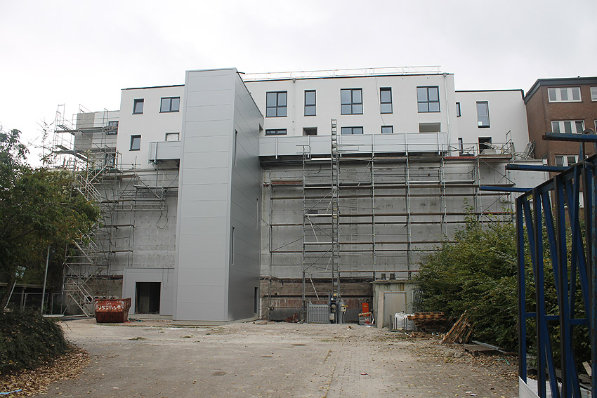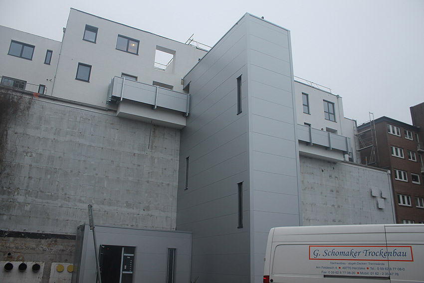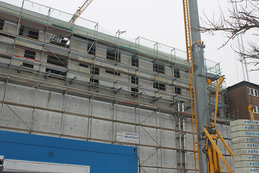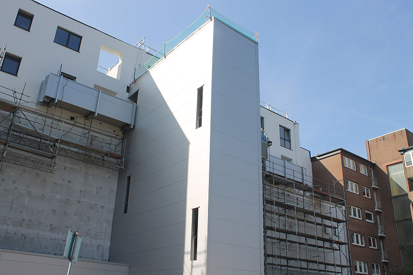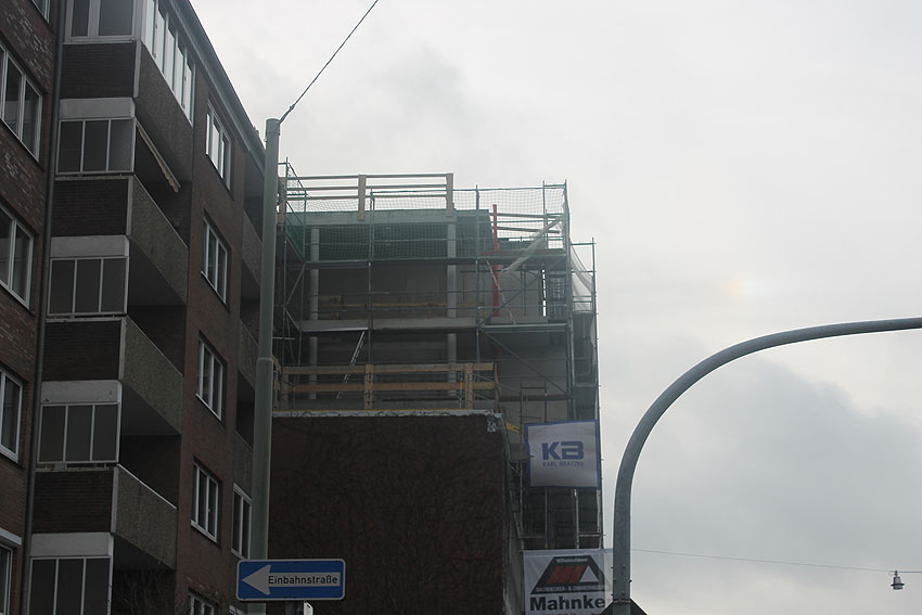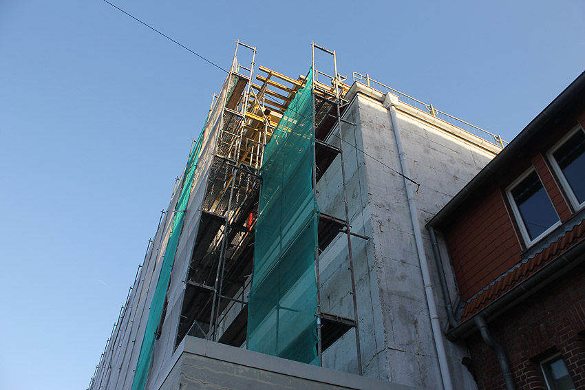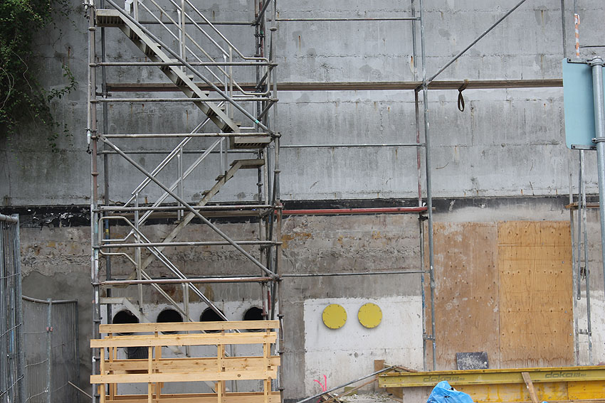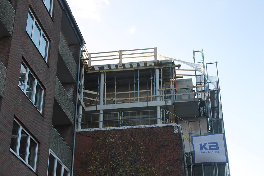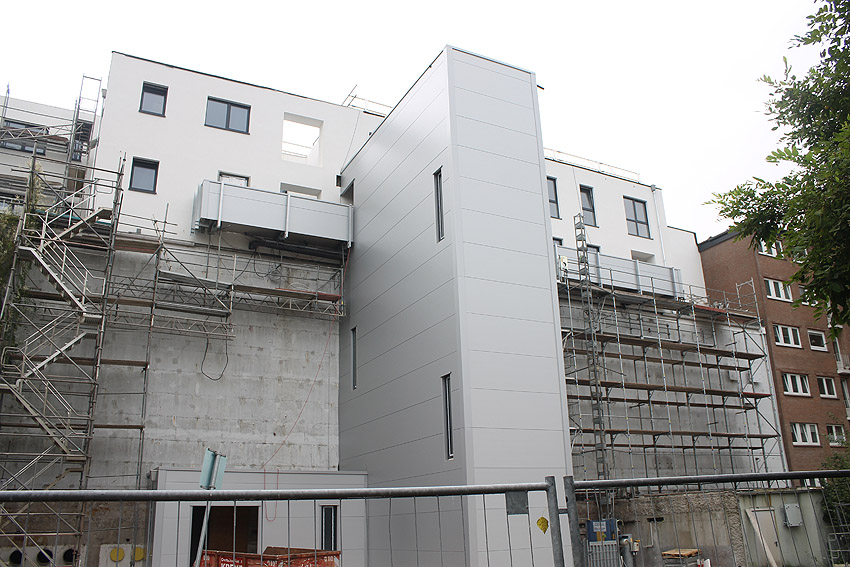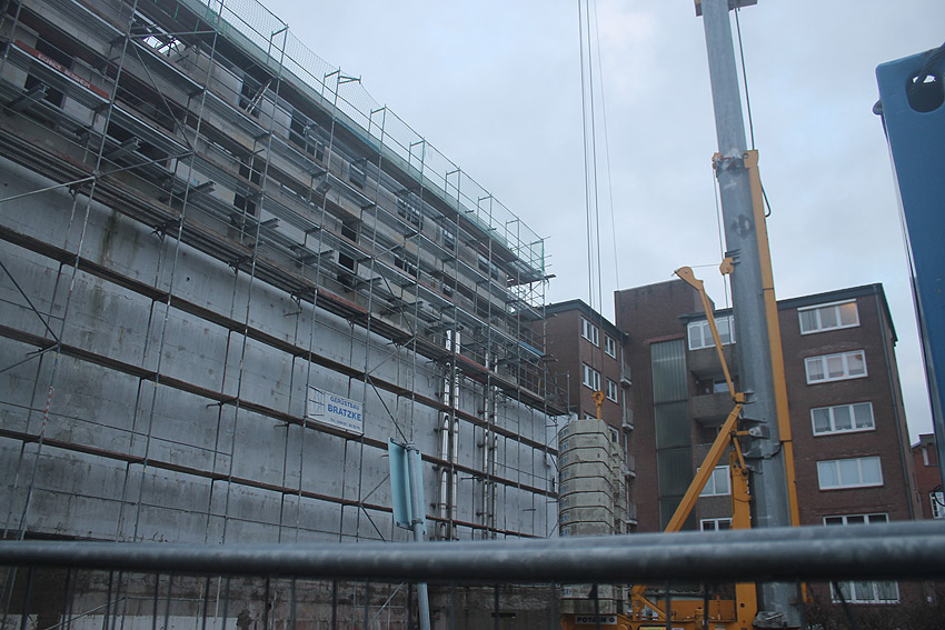 Am ehemaligen OP-Bunker Virchowstraße wird nun an der rückwärtigen Ostwand der Treppenhaus- und Fahrstuhlanbau für die aufgebauten Wohnungen errichtet. Wo genau der Fahrstuhl installiert wird, ist uns allerdings noch etwas unklar. Die Arbeiten gehen stetig weiter ihrer Vollendung entgegen.