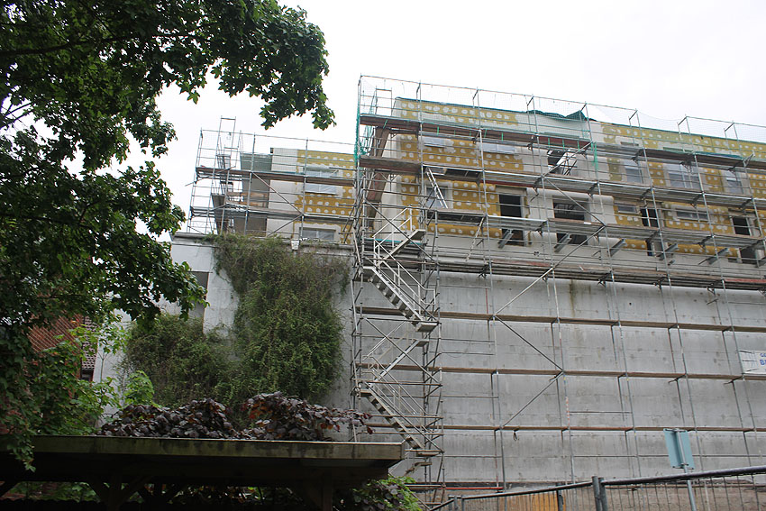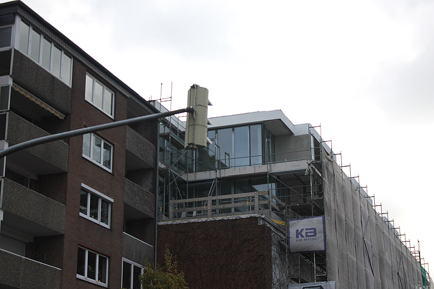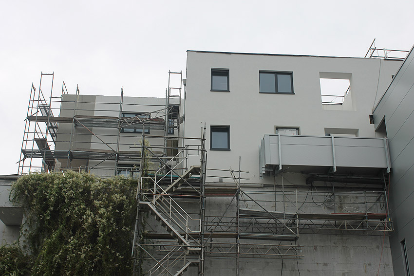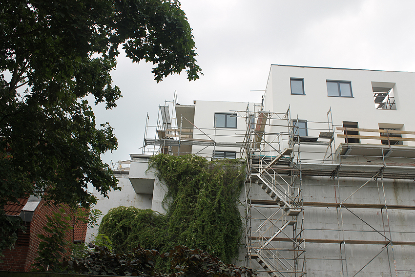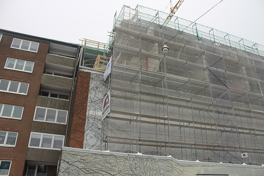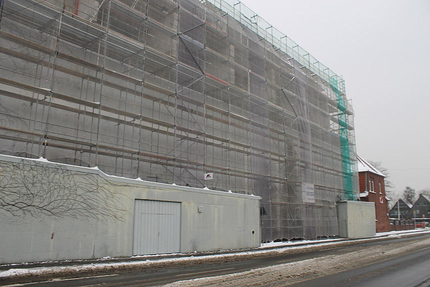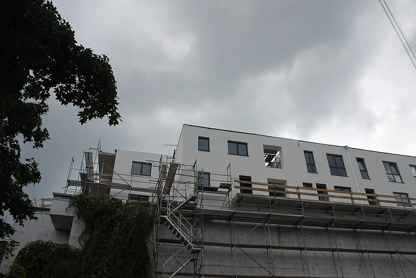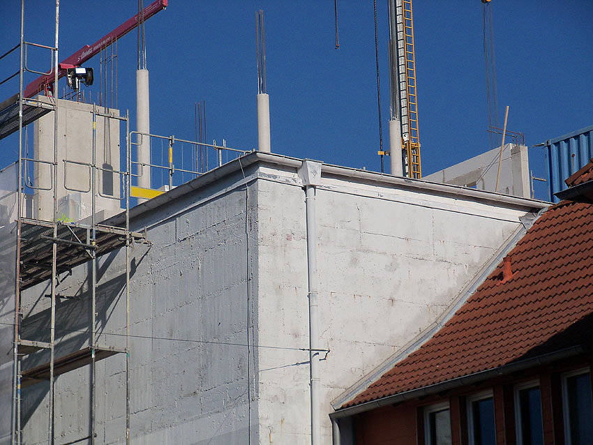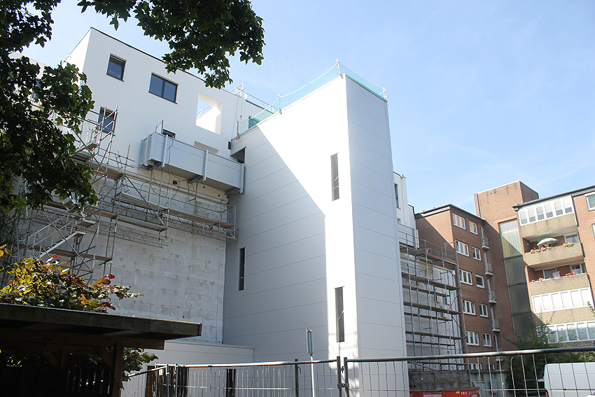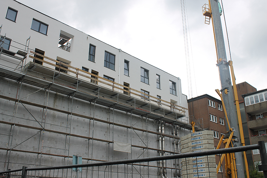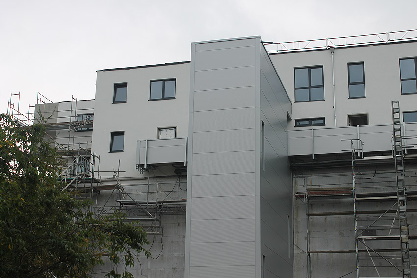 Am ehemaligen OP-Bunker Virchowstraße wird nun an der rückwärtigen Ostwand der Treppenhaus- und Fahrstuhlanbau für die aufgebauten Wohnungen errichtet. Wo genau der Fahrstuhl installiert wird, ist uns allerdings noch etwas unklar. Die Arbeiten gehen stetig weiter ihrer Vollendung entgegen.