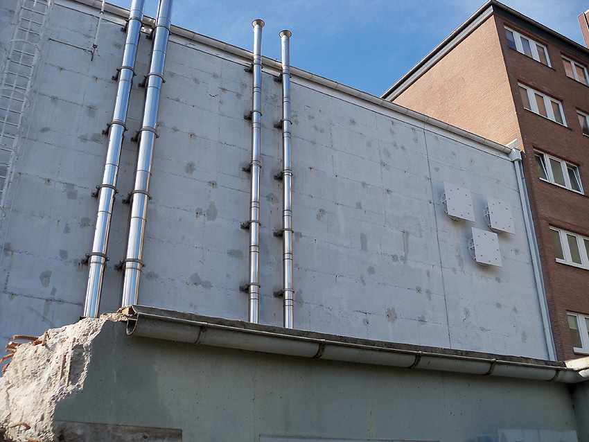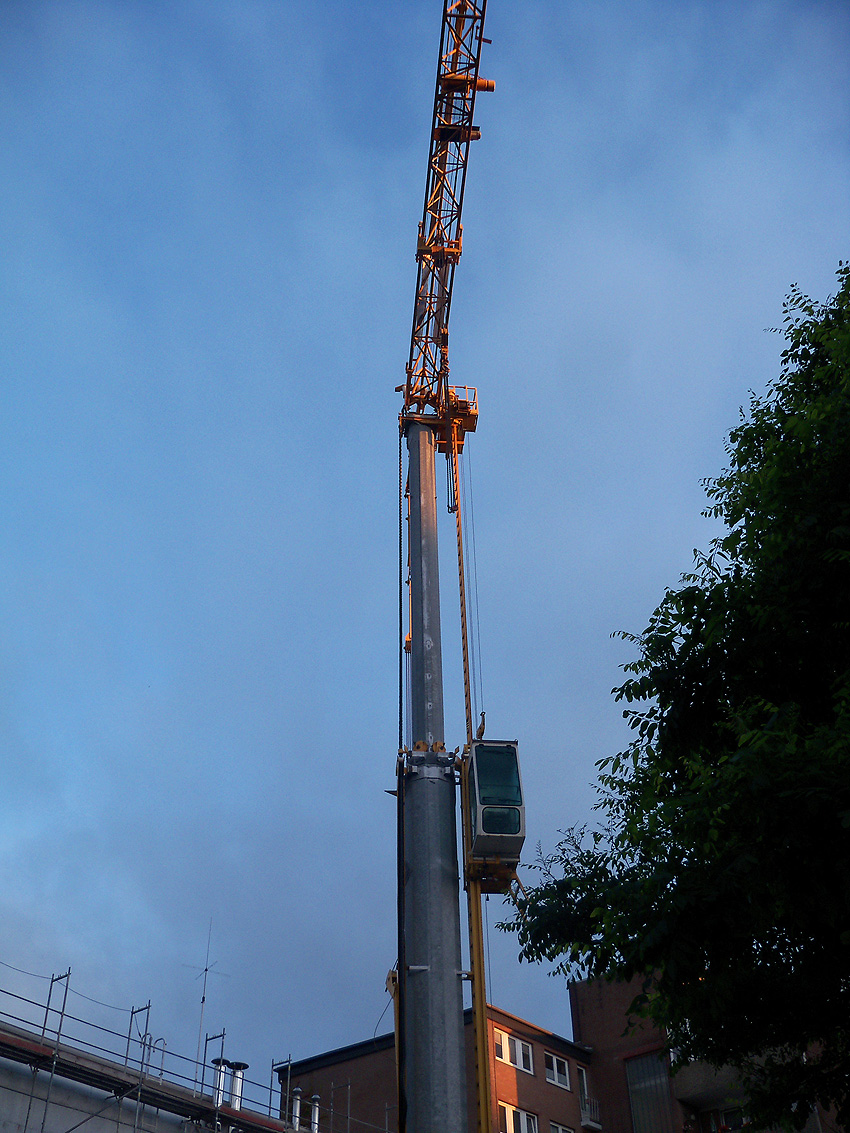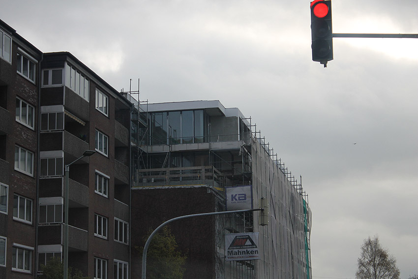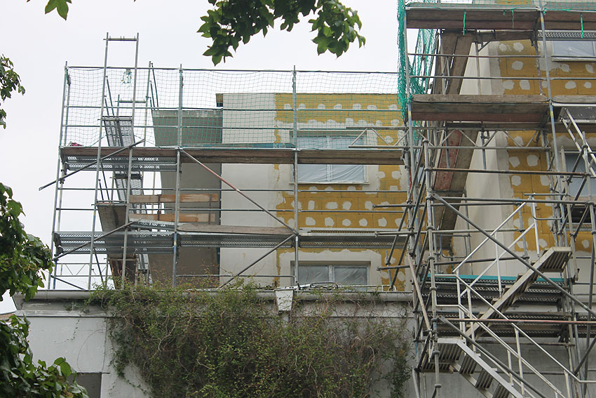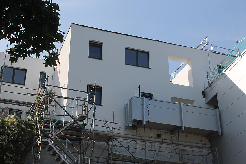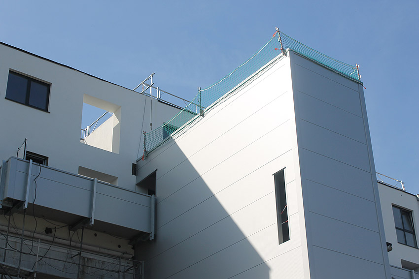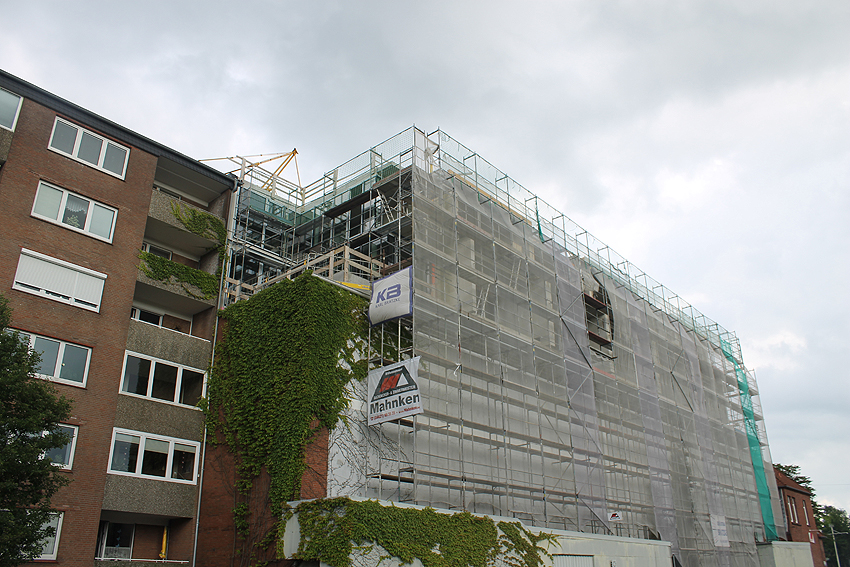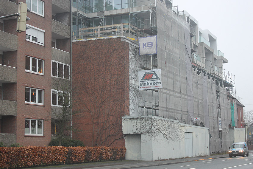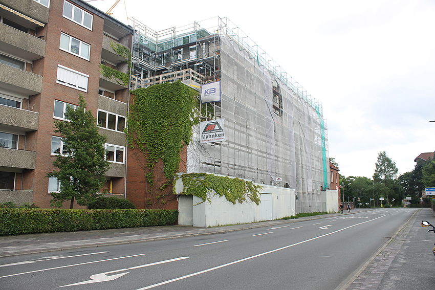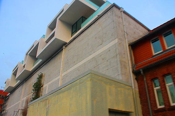 Am ehemaligen OP-Bunker Virchowstraße wird nun an der rückwärtigen Ostwand der Treppenhaus- und Fahrstuhlanbau für die aufgebauten Wohnungen errichtet. Wo genau der Fahrstuhl installiert wird, ist uns allerdings noch etwas unklar. Die Arbeiten gehen stetig weiter ihrer Vollendung entgegen.
