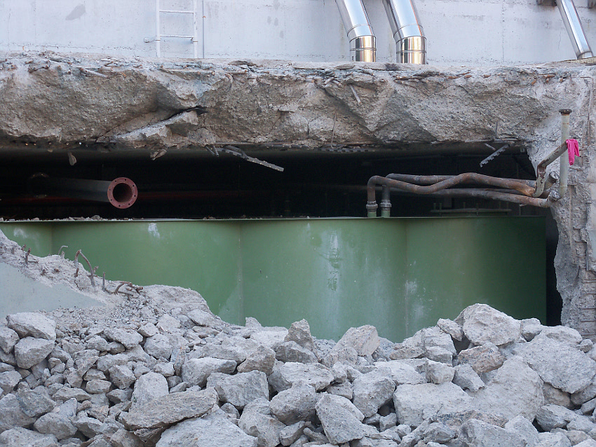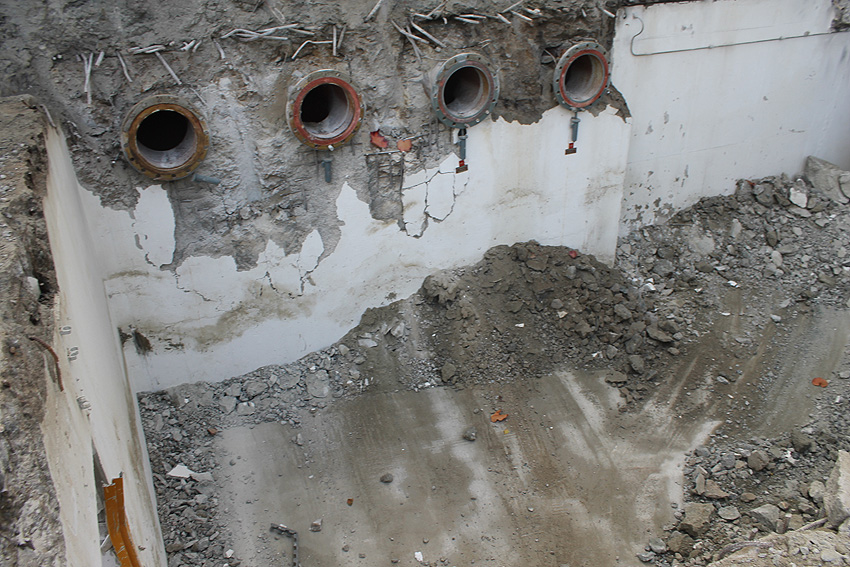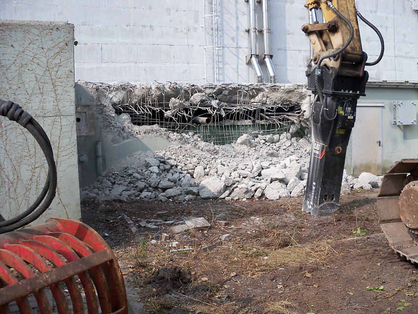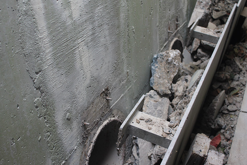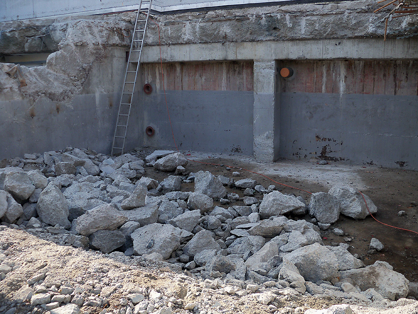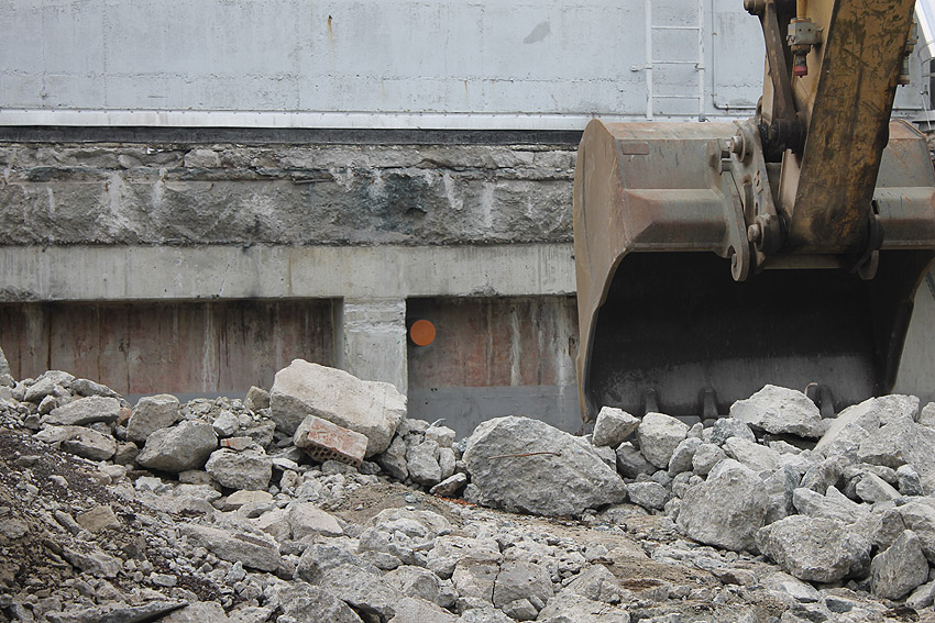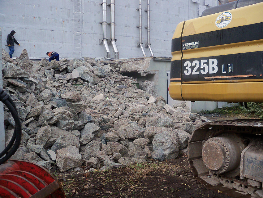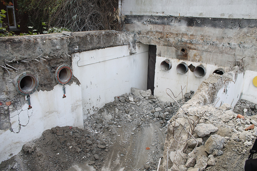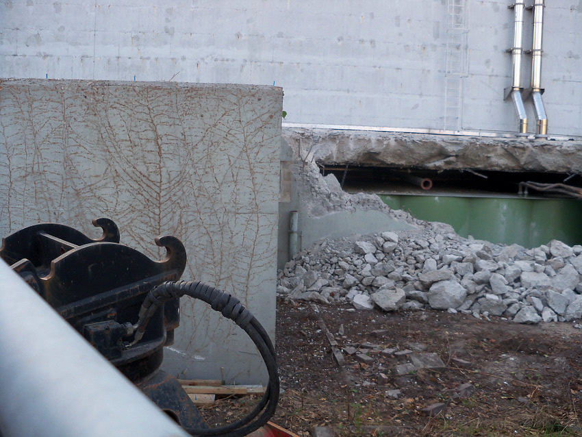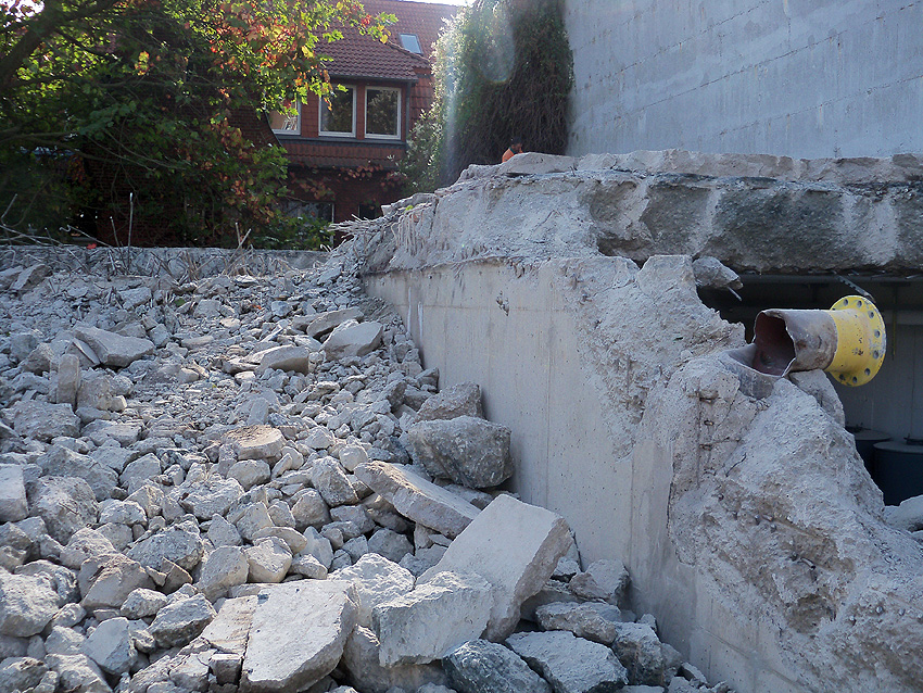 Hier im Hintergrund an der Hauptbunkerkörperwand letzte Reste der ehemaligen Ziegelrot-Tarnbemalung der Wände, geschützt lange Zeit vor der Witterung durch den nachkriegszeitigen Anbau (Zivilschutzbindung). Der Beginn vom Ursprungsanbau befand sich genau rechts an der Baggerschaufel.