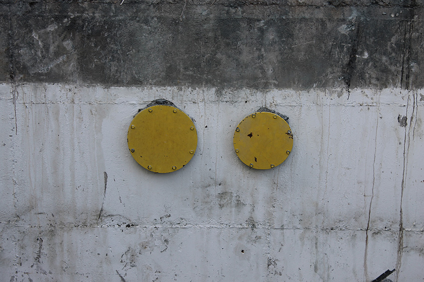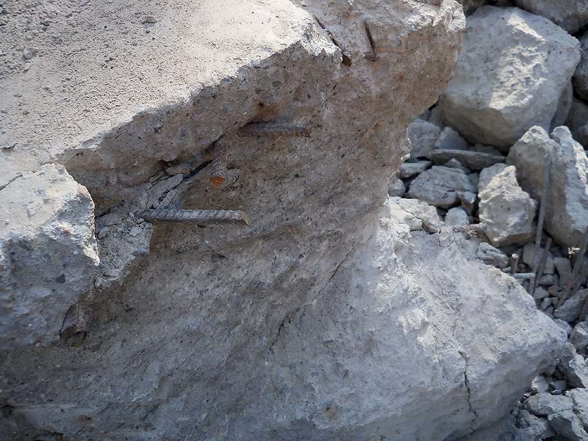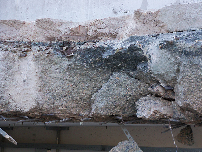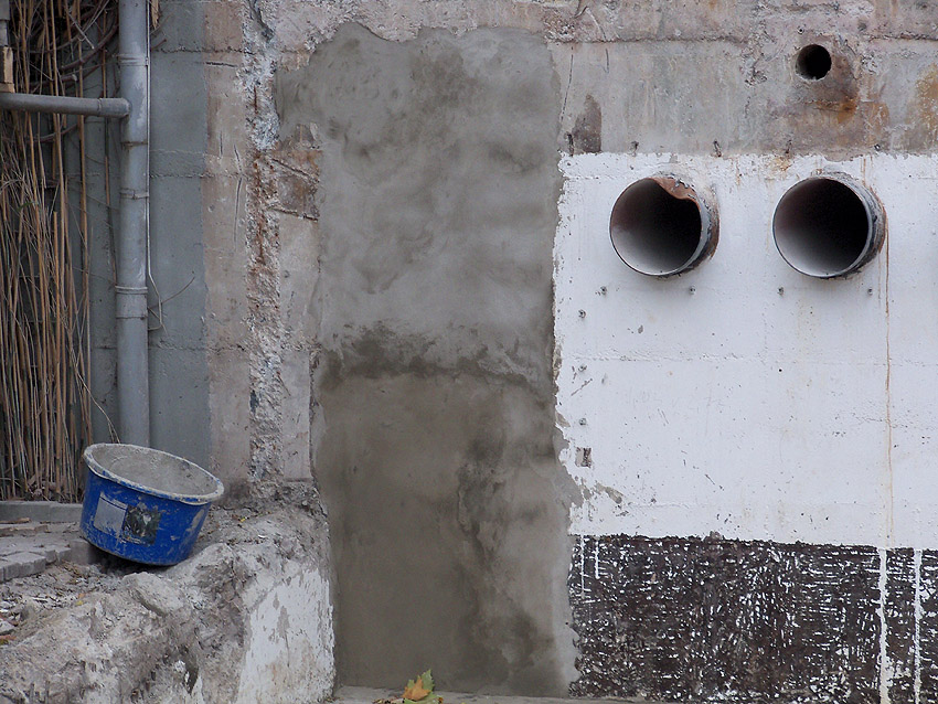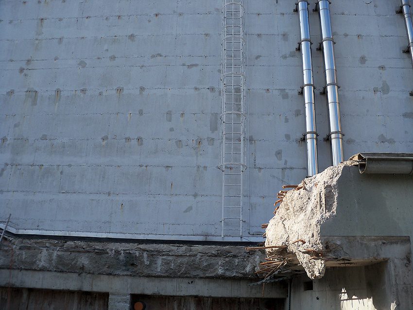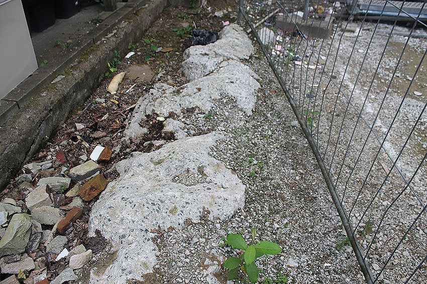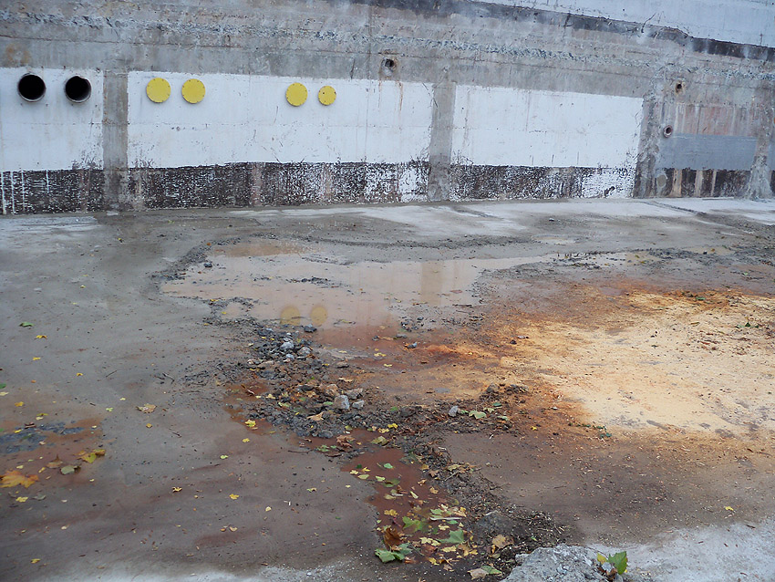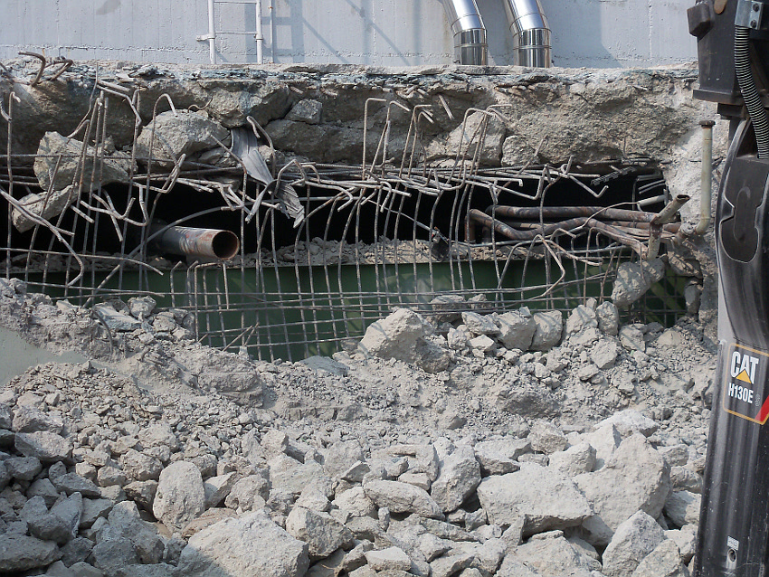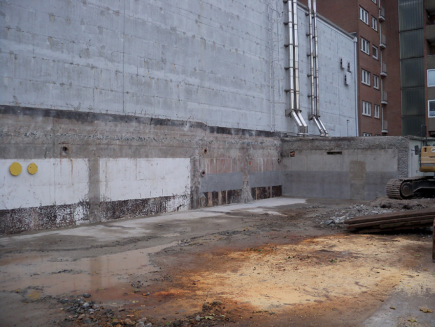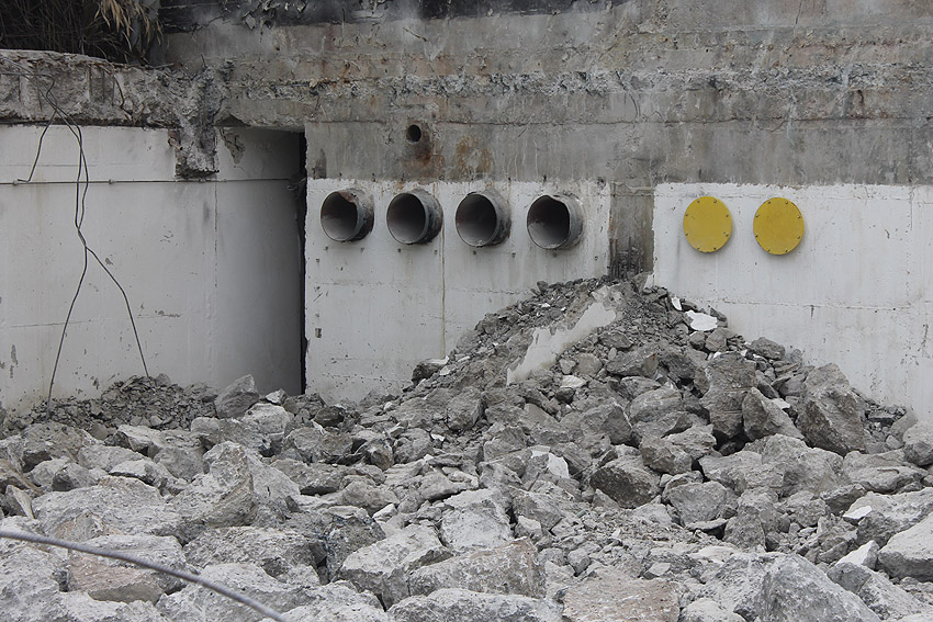 Hier im Hintergrund an der Hauptbunkerkörperwand letzte Reste der ehemaligen Ziegelrot-Tarnbemalung der Wände, geschützt lange Zeit vor der Witterung durch den nachkriegszeitigen Anbau (Zivilschutzbindung). Der Beginn vom Ursprungsanbau befand sich genau rechts an der Baggerschaufel.