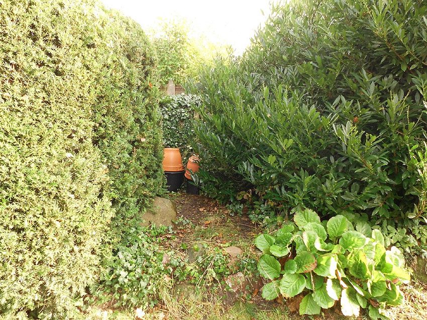 Der Schutzraum liegt völlig versteckt unter Bepflanzung und Sträuchern. Die Druckschutztür im Inneren ist nicht mehr vorhanden.