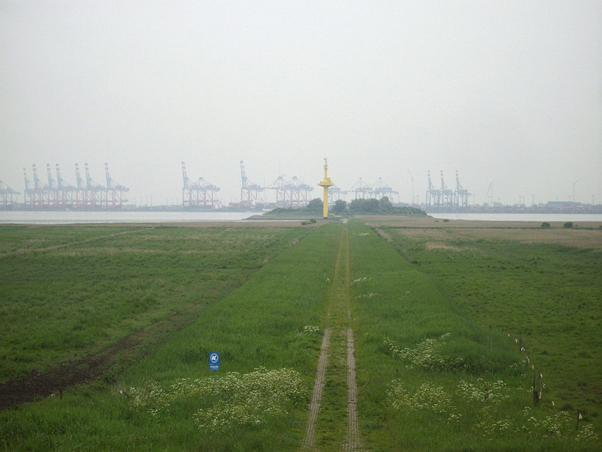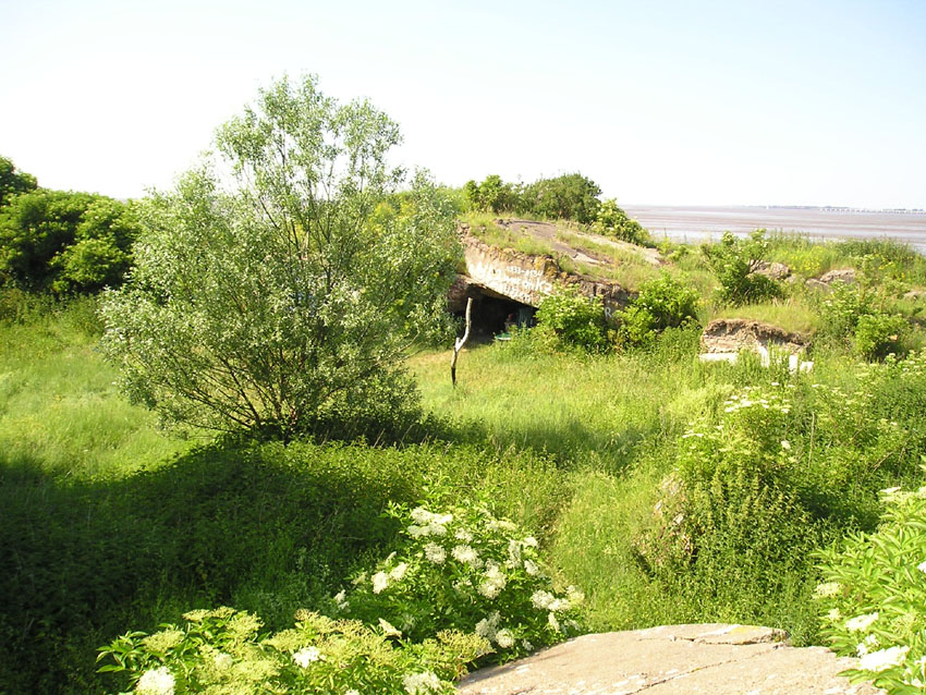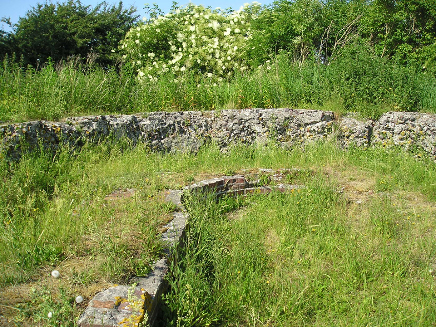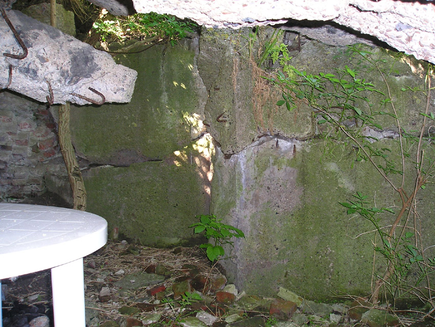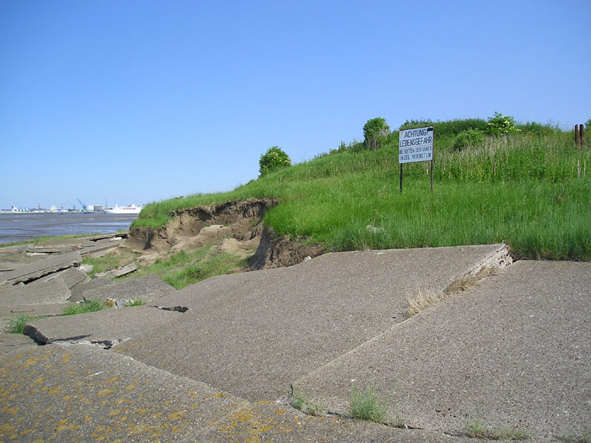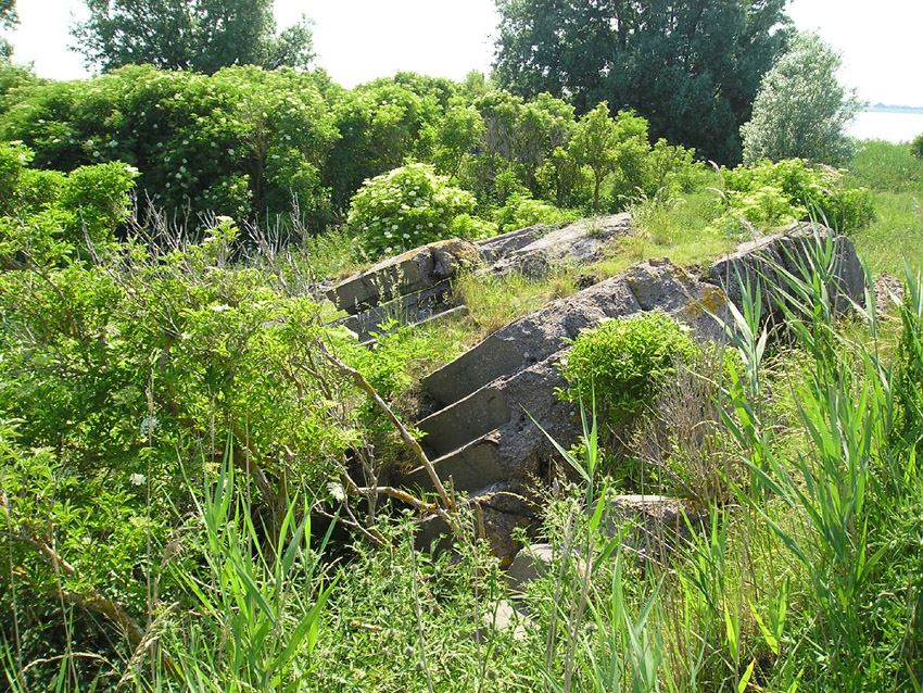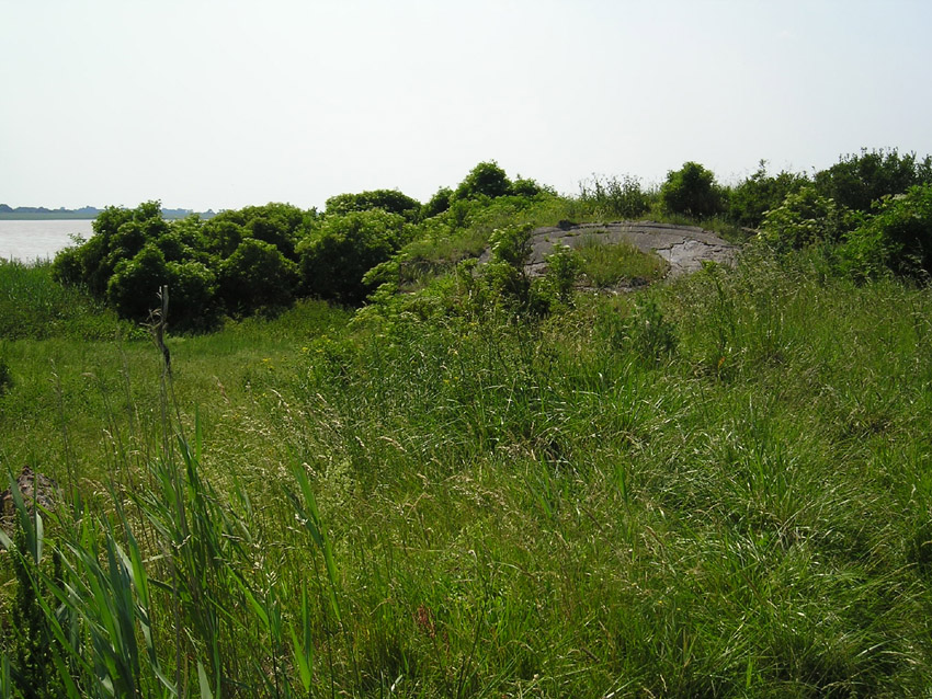 Folgende Bilder: Das ersichtliche Betonfundament und das Gebäude links im Hintergrund, gelegen direkt hinter dem Deich nahe der Zuwegung zu Langlütjen I, sind Relikte aus dem WK 2. Hier befanden sich Unterkünfte für die Mannschaften von Langlütjen I. Auf dem Ring-Betonfundament stand eine Wehrmachtsbaracke.
