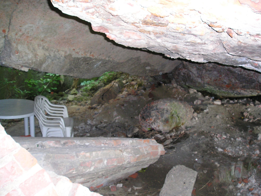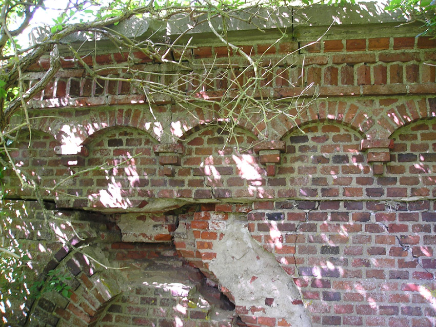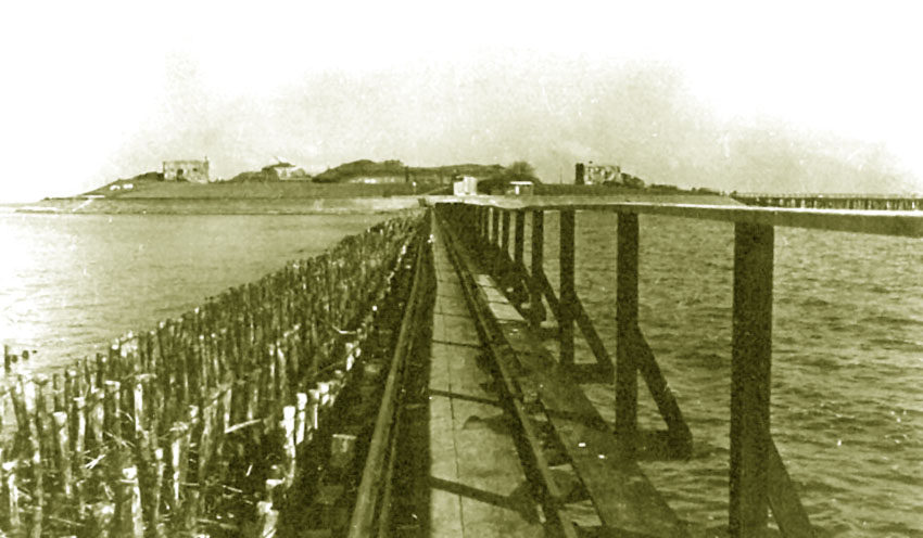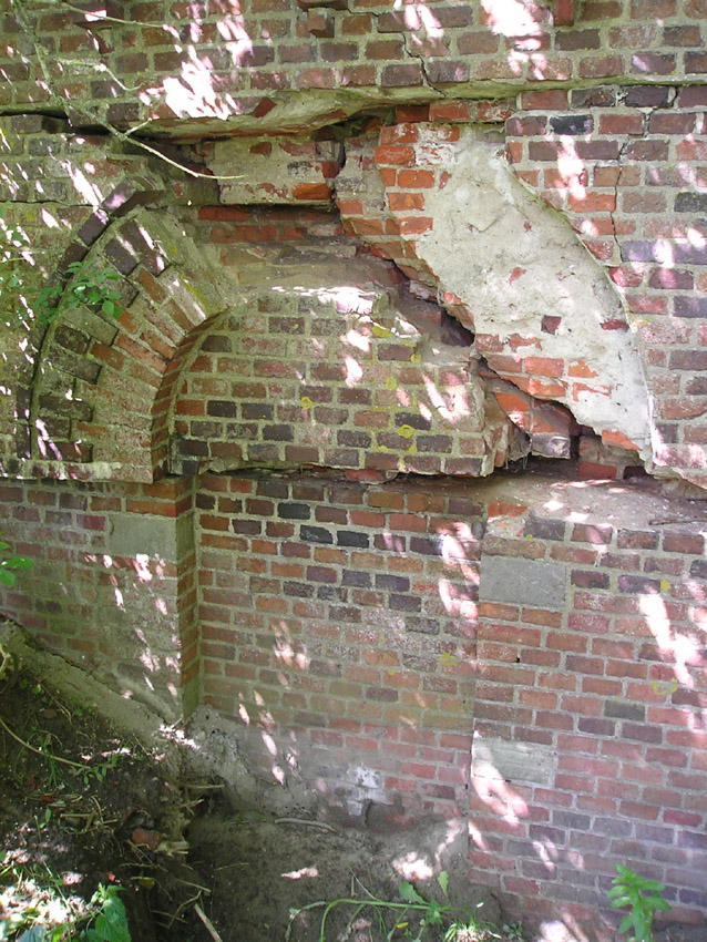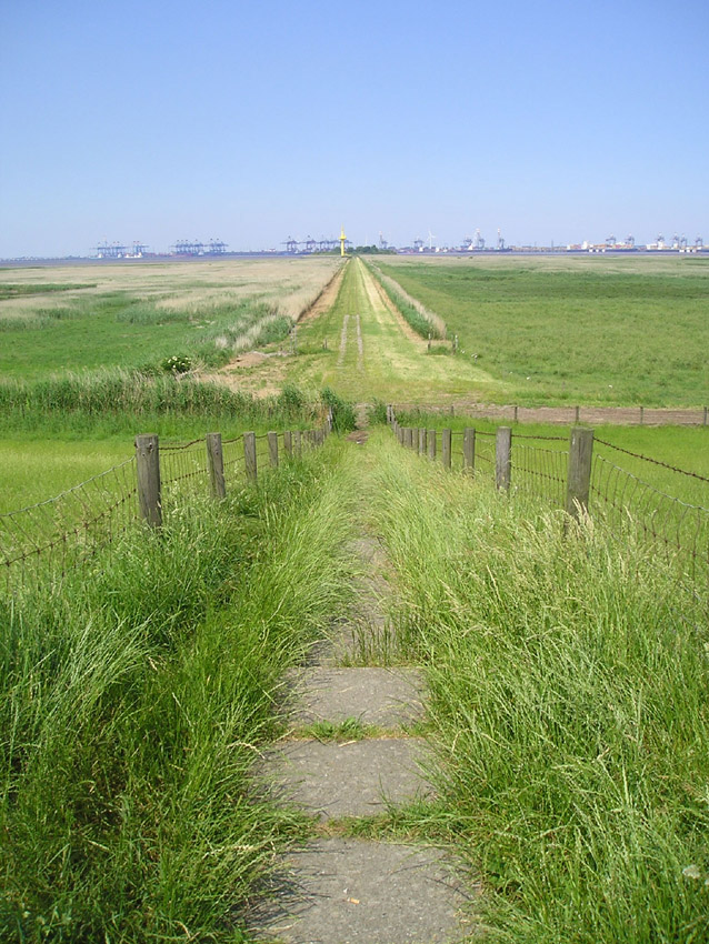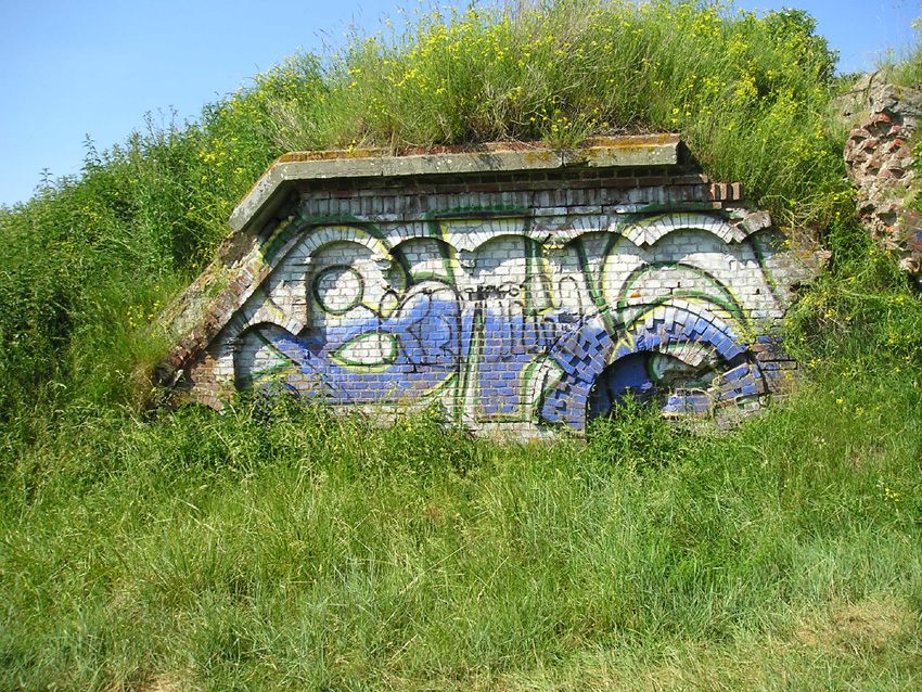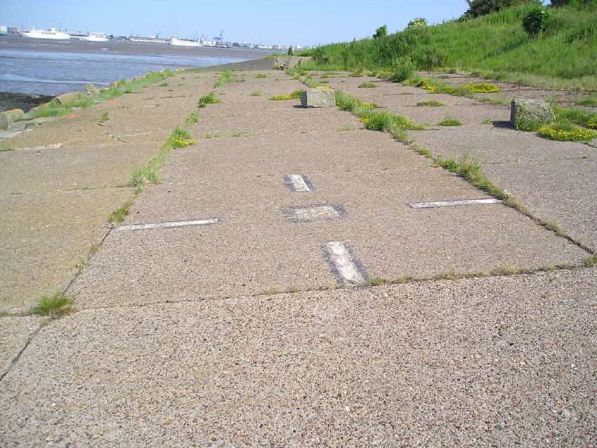 Folgende Bilder: Das ersichtliche Betonfundament und das Gebäude links im Hintergrund, gelegen direkt hinter dem Deich nahe der Zuwegung zu Langlütjen I, sind Relikte aus dem WK 2. Hier befanden sich Unterkünfte für die Mannschaften von Langlütjen I. Auf dem Ring-Betonfundament stand eine Wehrmachtsbaracke.