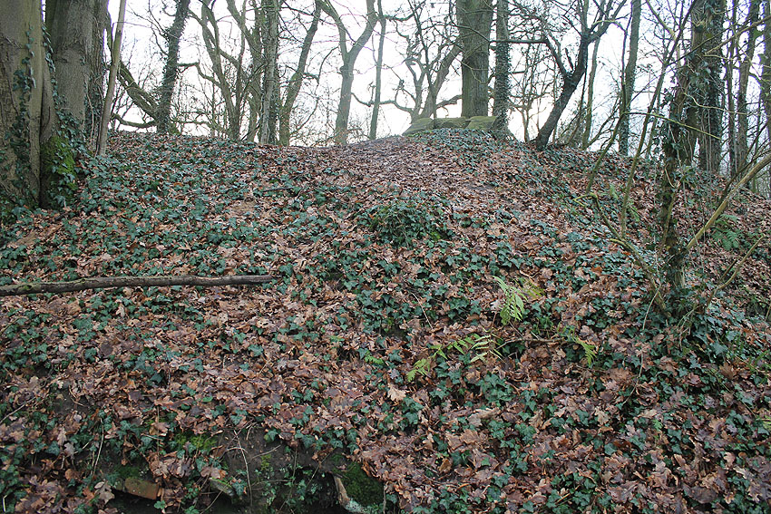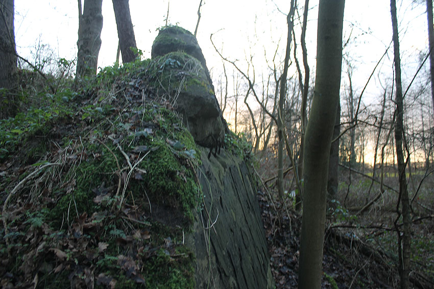 Decke fast komplett erhalten / durch Sprengung in leichter Schräglage / Lüftungsschornsteine erhalten / Erdum- überböschung großteilig erhalten