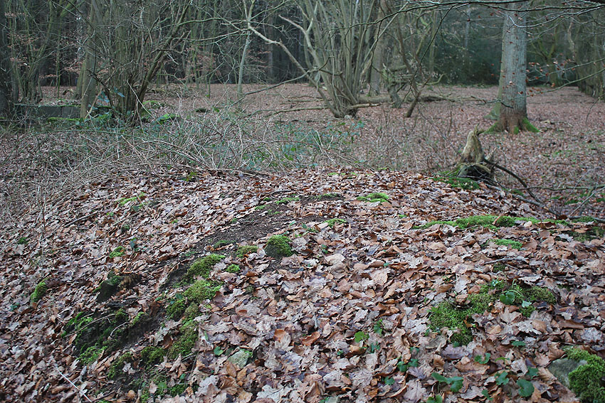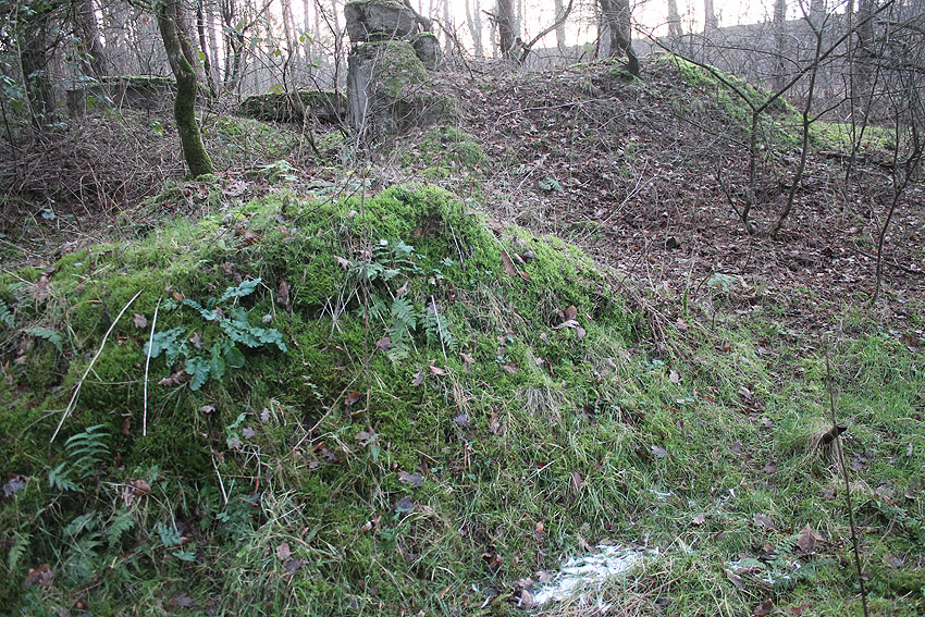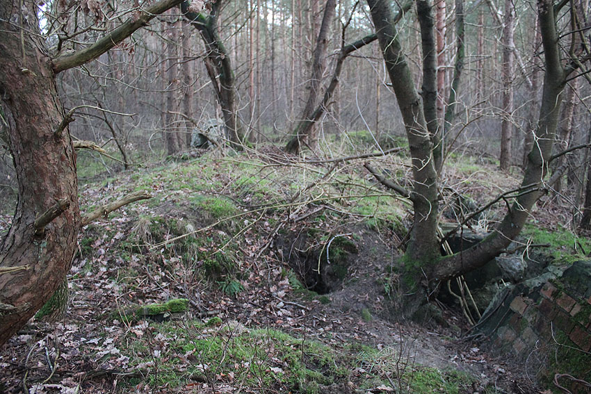 Decke und Wände großteilig zerstört / Trümmer großteilig beseitigt / augenscheinlich nur Eingangswände links und rechts teilweise erhalten / augenscheinlich Rest zumindest eines Lüftungsschornsteines erhalten / Erdum- überböschung in Ansätzen erhalten