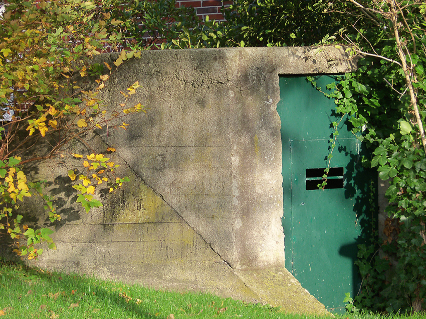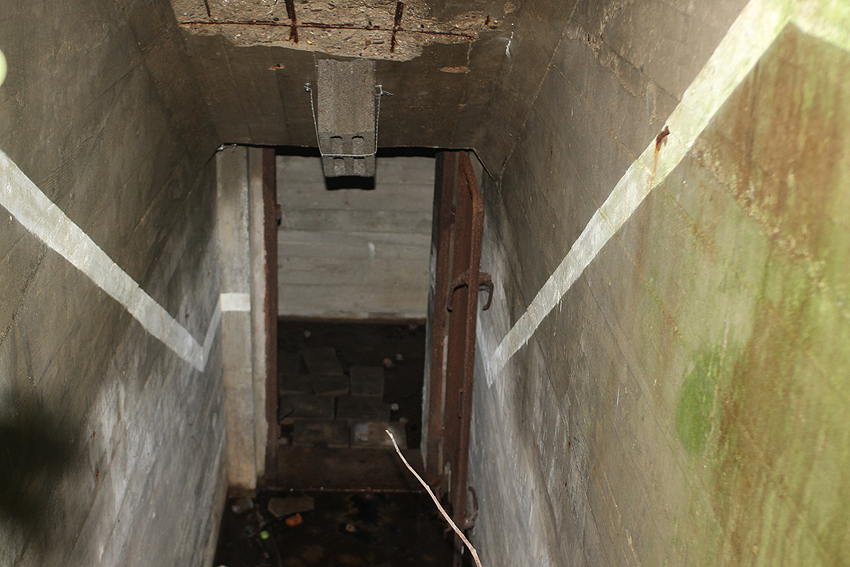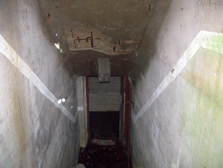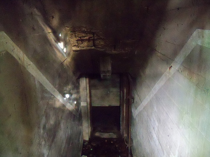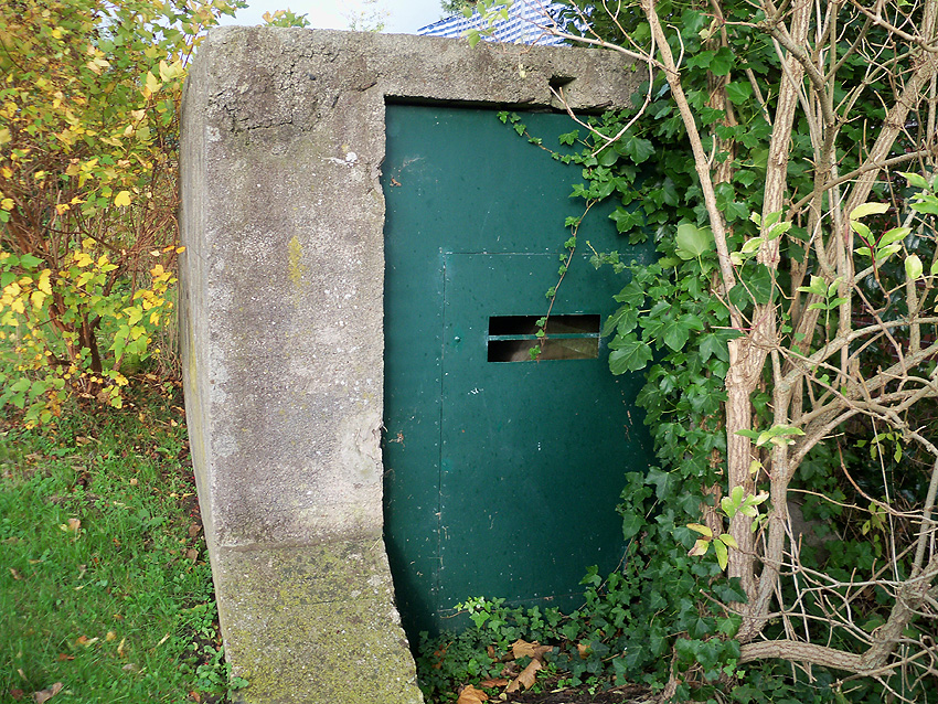 Der Splitterschutz-Überbau des Westeinganges ist mittlerweile nach vorne abgesackt / abgebrochen. Im nun offen liegenden Oberbereich wurde eine neue Fledermauseinflugs- ausflugsöffnung geschaffen. Möglicherweise ist der Überbau auch bewusst nach vorn gedrückt worden, um den Fledermäusen einen "besseren Einflug" zu gewährleisten.