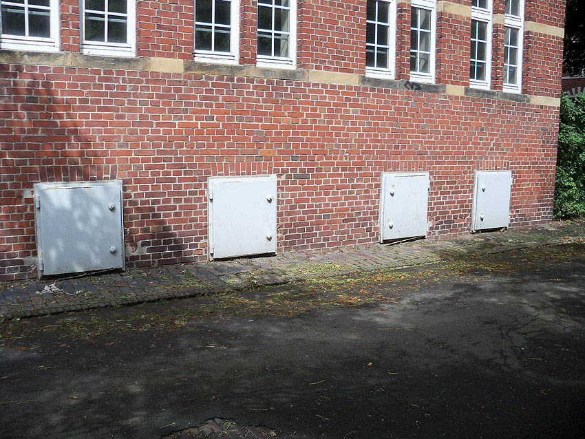 09.07.16: Hier finden zur Zeit Sanierungsmaßnahmen statt für die baldige Nutzung des Gebäudes als Grundschule. Die 10 noch erhalten gewesenen LS-Klappen sind bereits abgebaut worden und durch herkömmliche Stahlplatten ersetzt worden. Wir berichten weiter.