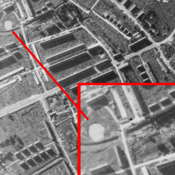 Oben östlich zu sehen die nicht fertig gestellte Zerschellerplatte des Turmes Dirschauer Straße, mittig westlich die fertig gestellte Zerschellerplatte des Turmes Weichselstraße und unten südlich die Zerschellerplatte mit Beginn (Aushub) des Turmkörpers sowie der Splitterschutzvorbauten an der Elbinger Straße.