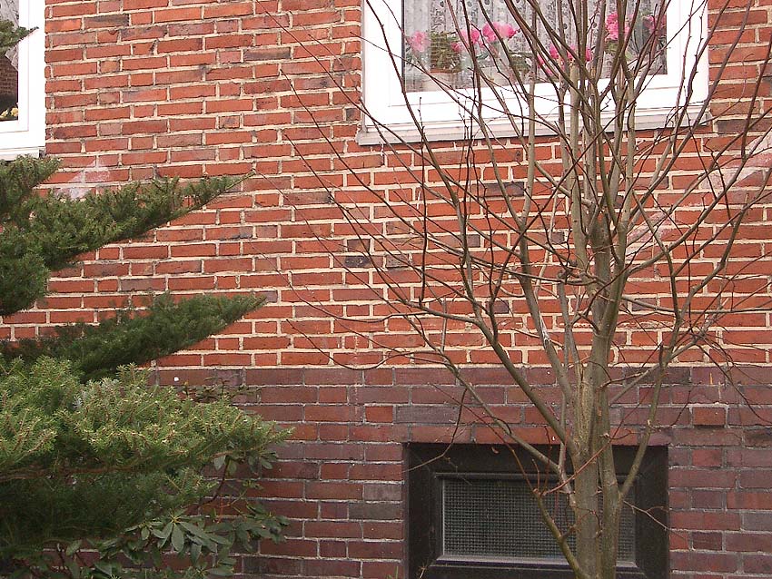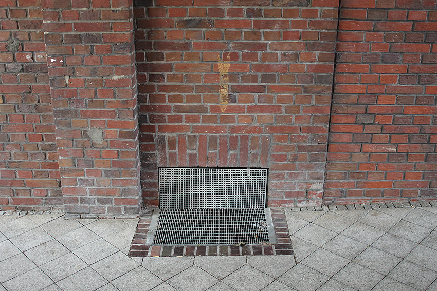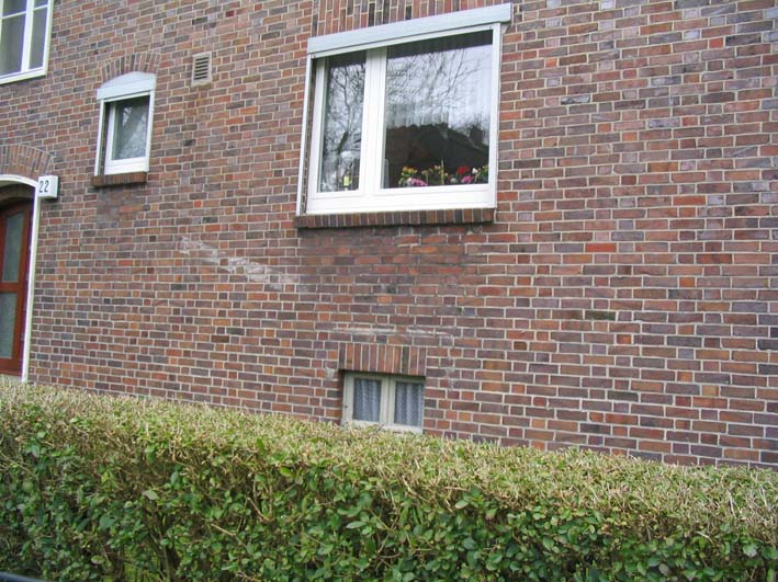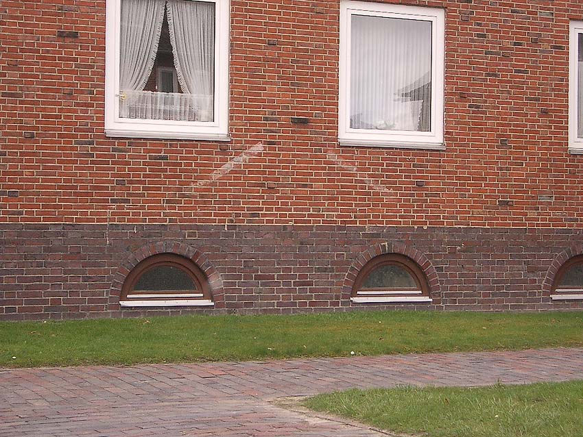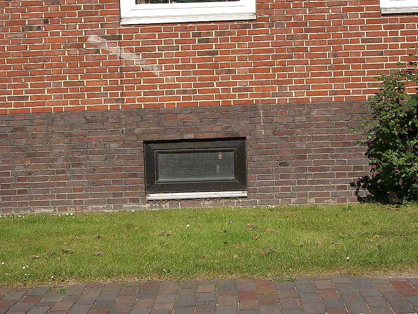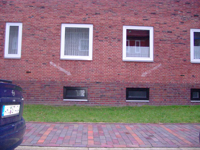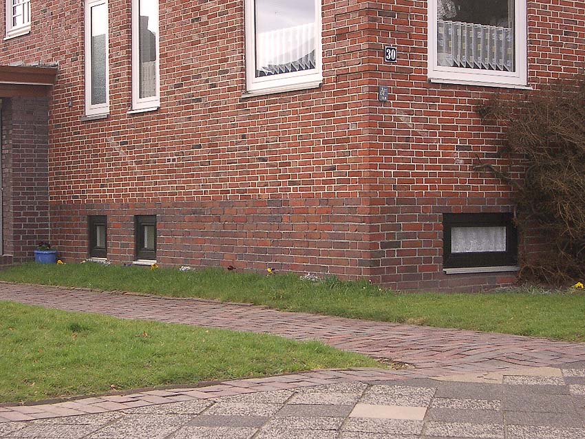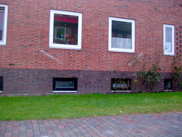 Wilhelmshaven / Kurpark / Bremer Straße 15 (im Hindenburgtor) / im Jahr 2023 erhalten (im Kellerfensterschacht dürfte sich im Krieg ein Mannesmann-LS-Gitter befunden haben / der geklinkerte Rand wird nach Ausbau des Gitters gefertigt worden sein)