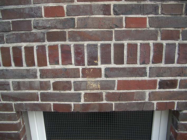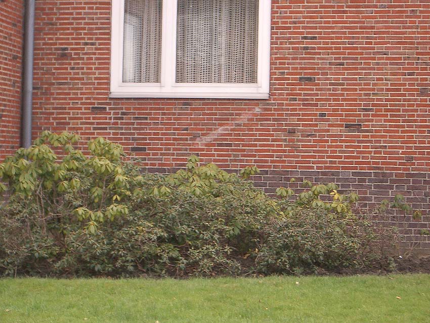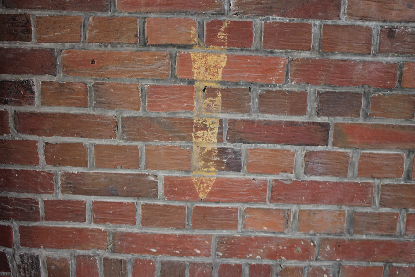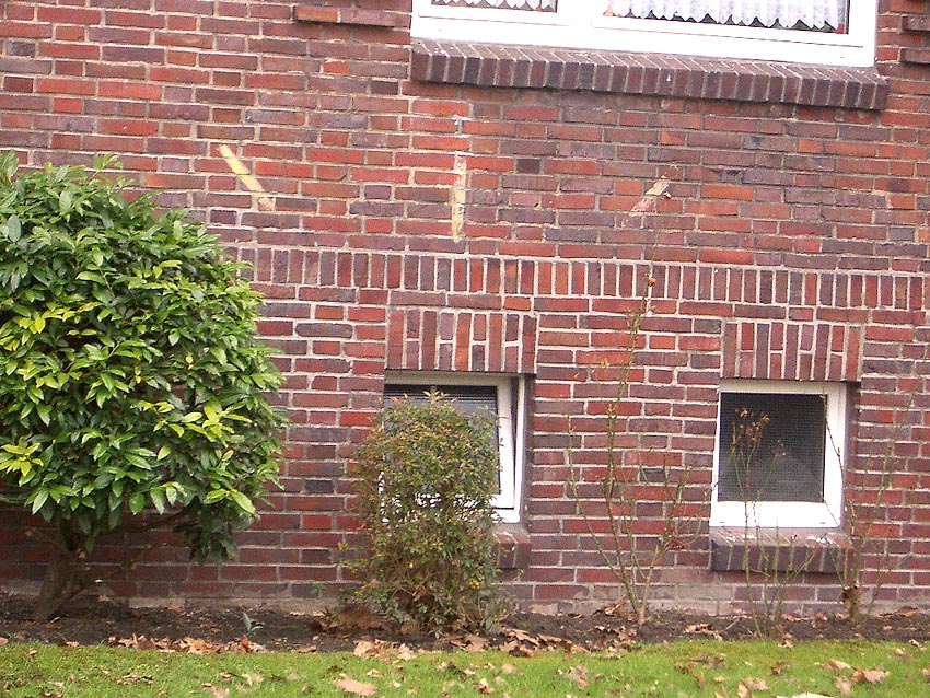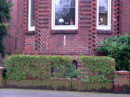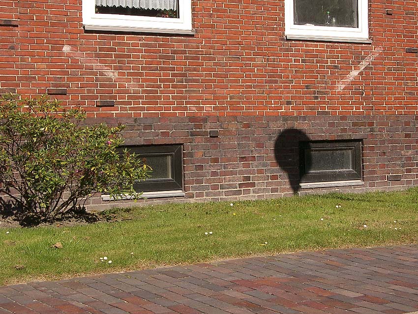 Es gibt auch Täuschungen. - Kein LS-Pfeil ist beispielsweise diese "Bemalung" am Mühlenweg 136 in Wilhelmshaven (unlogisch auch, da der "Pfeil" auf kein Kellerfenster zeigen würde...). Das Gebäude wurde erst nach 1945 errichtet...