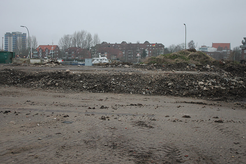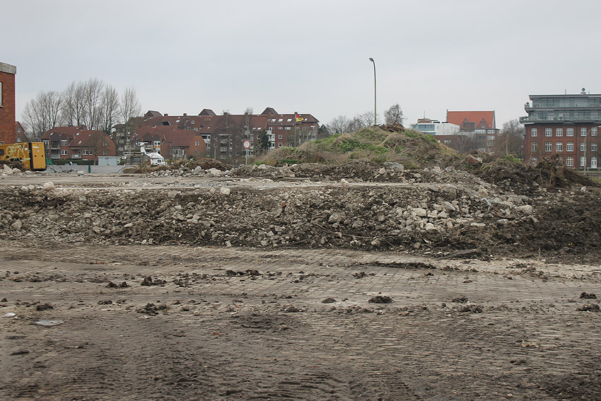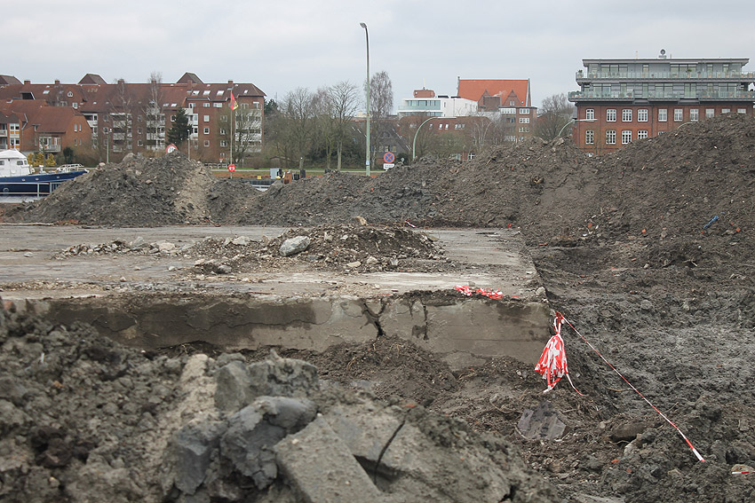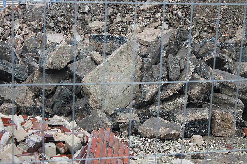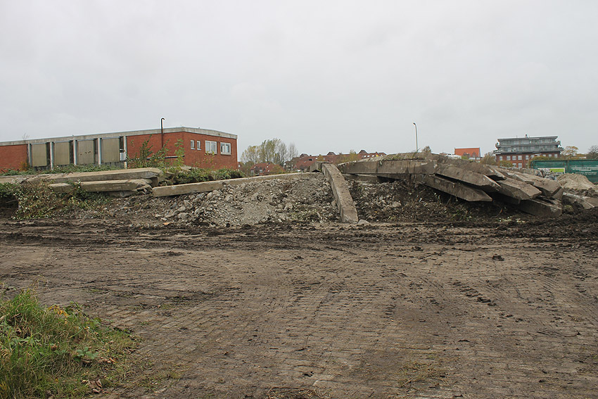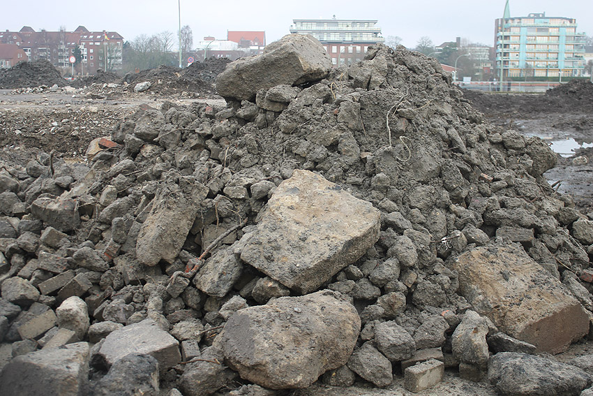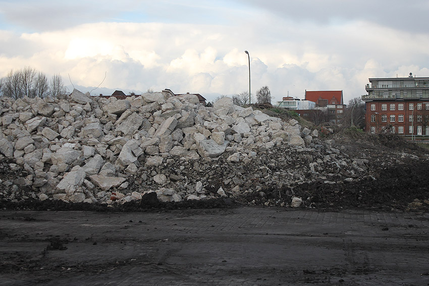 Alles ist abgerissen bis auf den Tiefbunker. Gewaltige Betontrümmer der Nachkriegsbauten-Fundamente türmen sich auf dem Gelände.