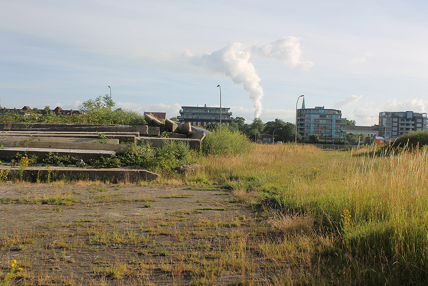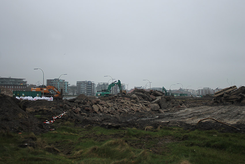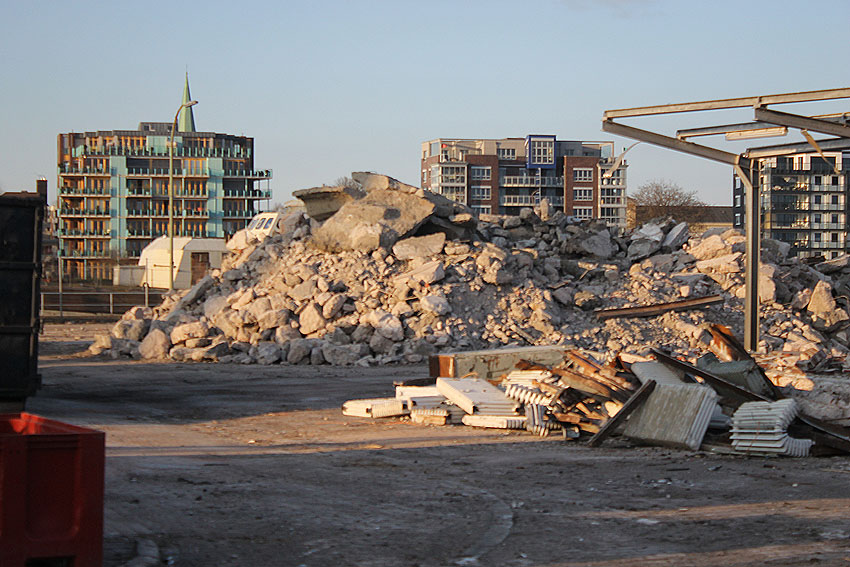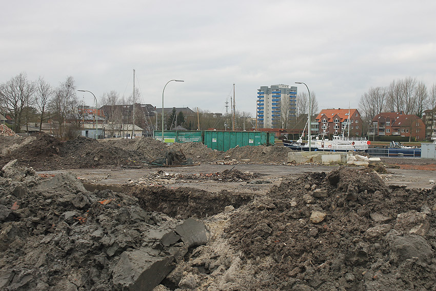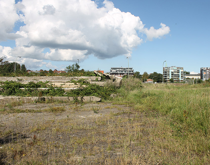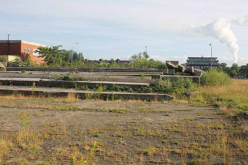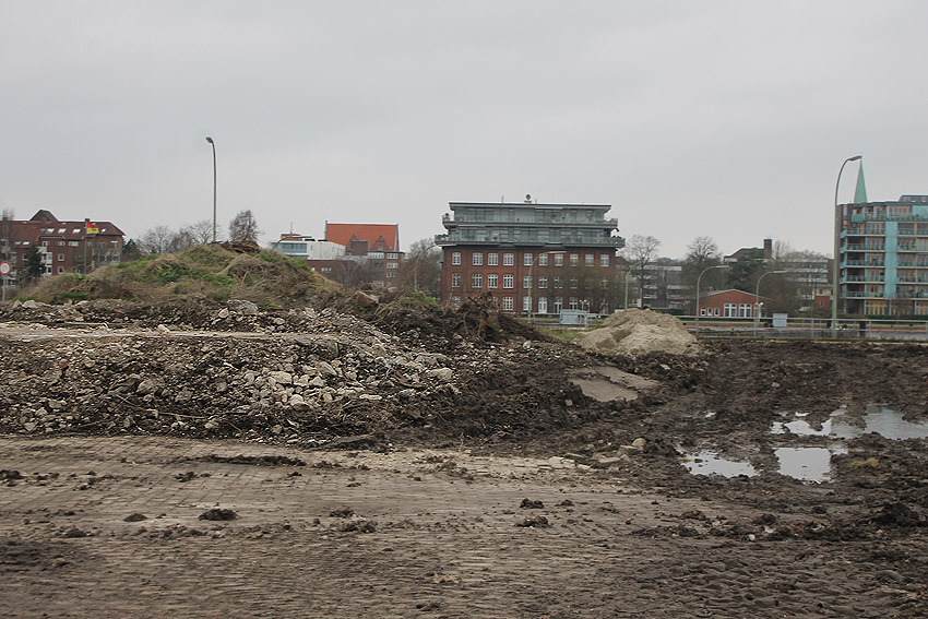 Alles ist abgerissen bis auf den Tiefbunker. Gewaltige Betontrümmer der Nachkriegsbauten-Fundamente türmen sich auf dem Gelände.