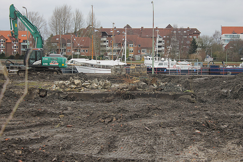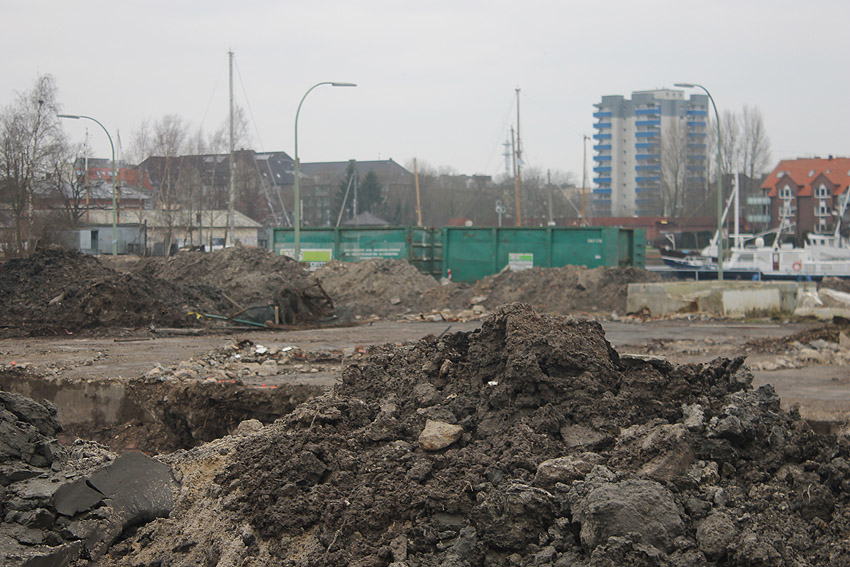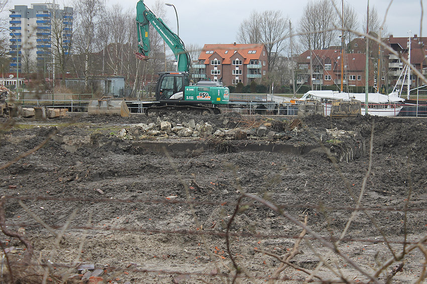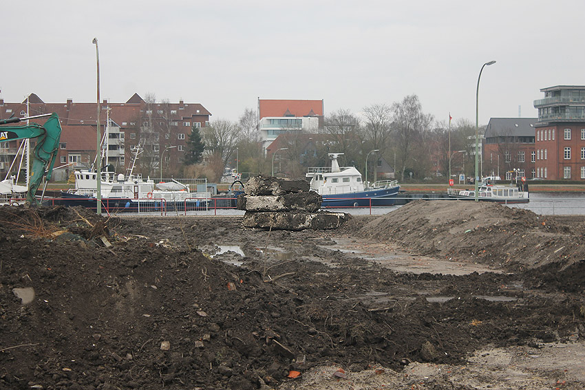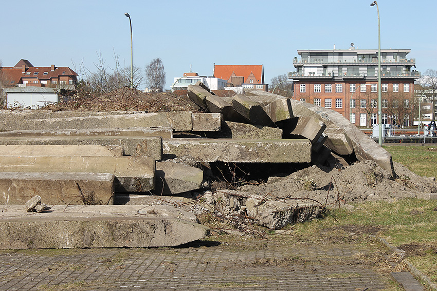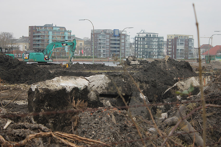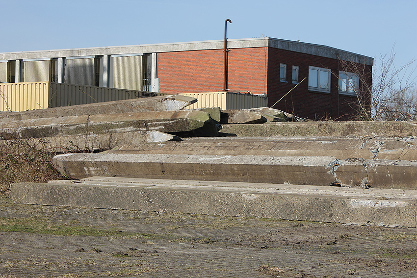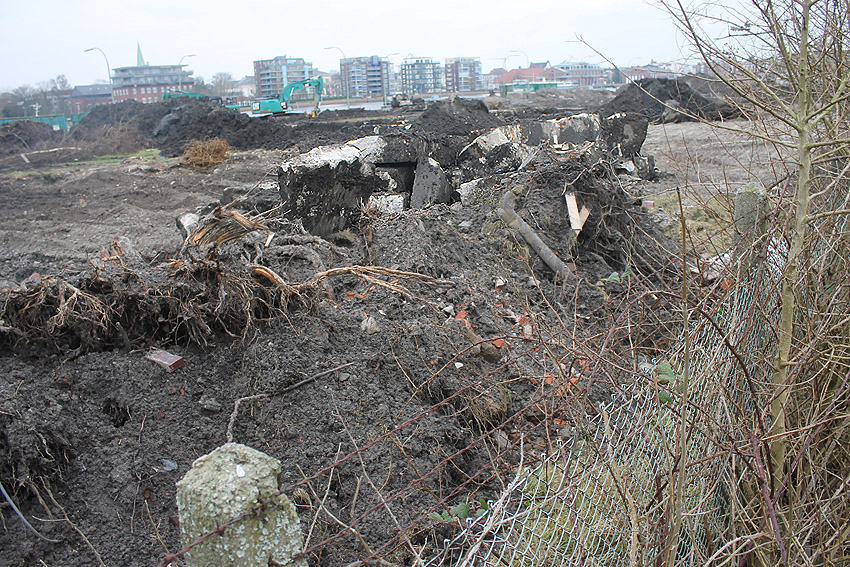 Überall auf dem Gelände häufen sich nun ans Tageslicht beförderte massive Betontrümmer und Quader (eventuell Gewichte für Bojenfestmachungen auf See). Der Tiefbunker wurde weiter freigelegt. Momentan ist der Kampfmittelräumdienst vor Ort. In Kürze dürfte eventuell damit begonnen werden, den komplett unter Wasser stehenden Tiefbunker zwecks Sondierung teilweise leerzupumpen.