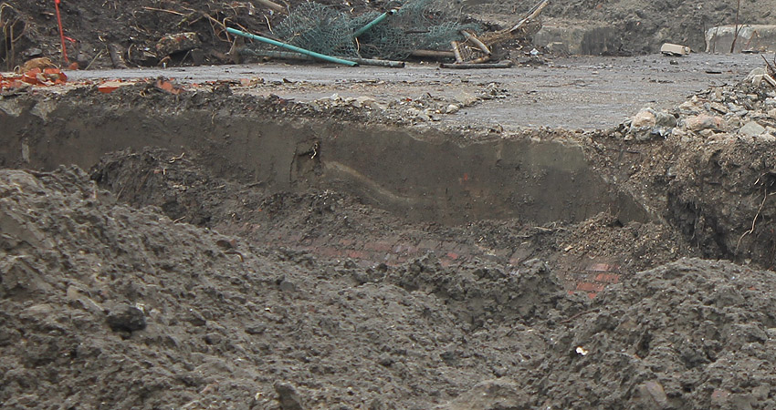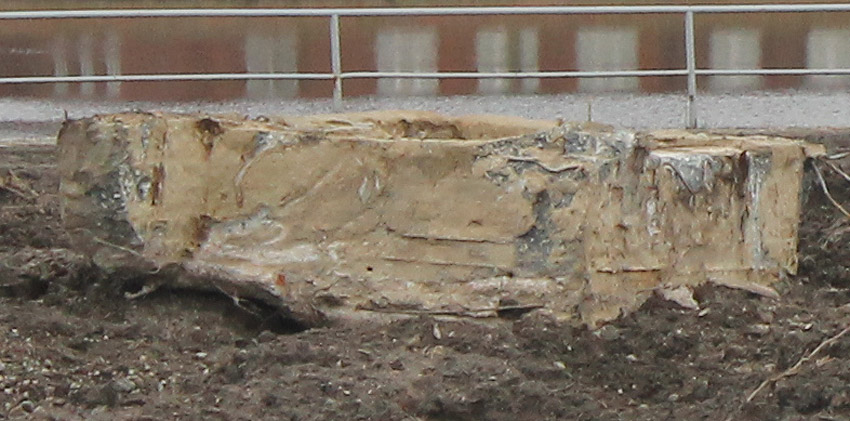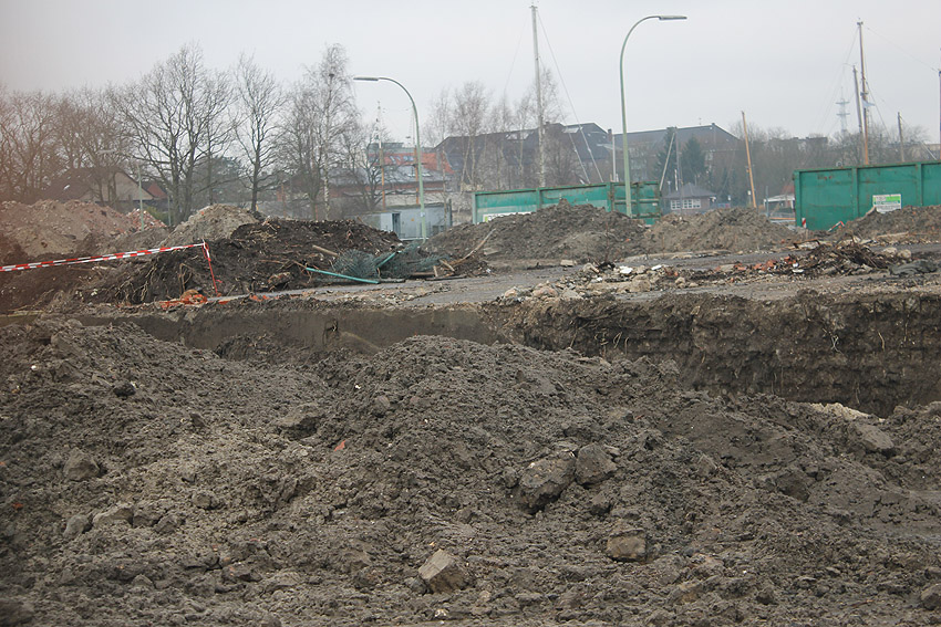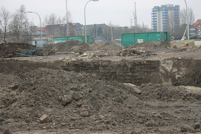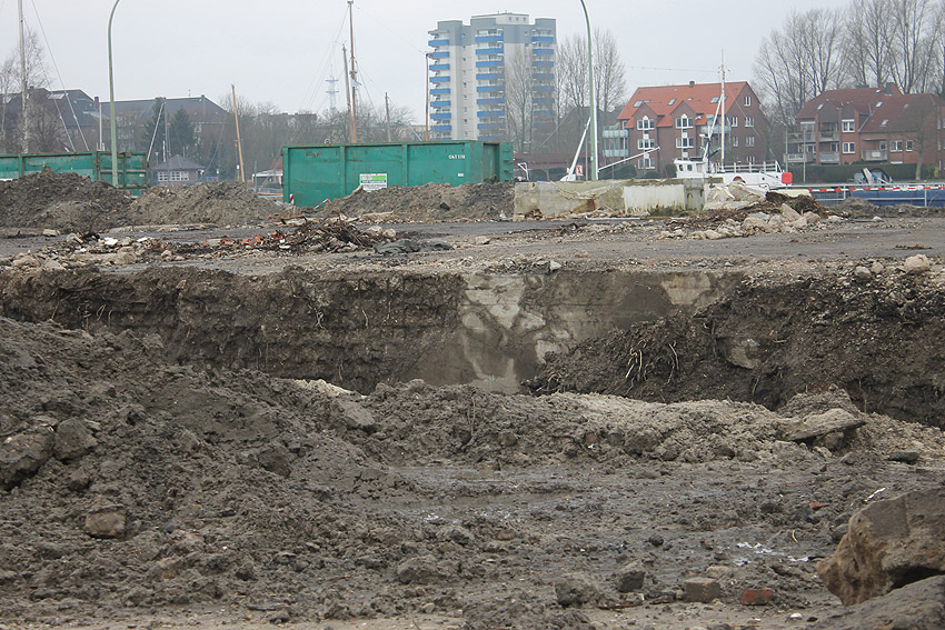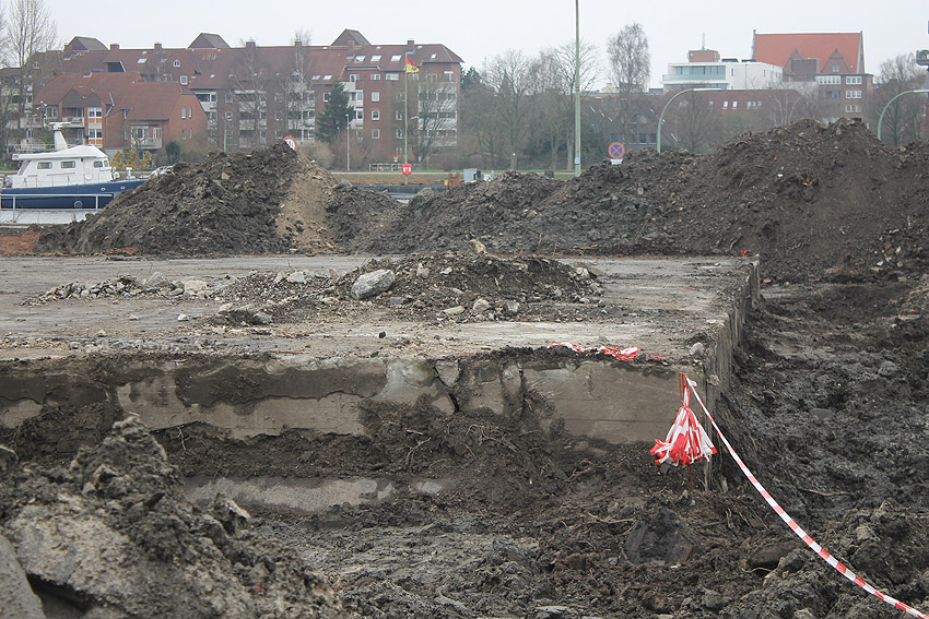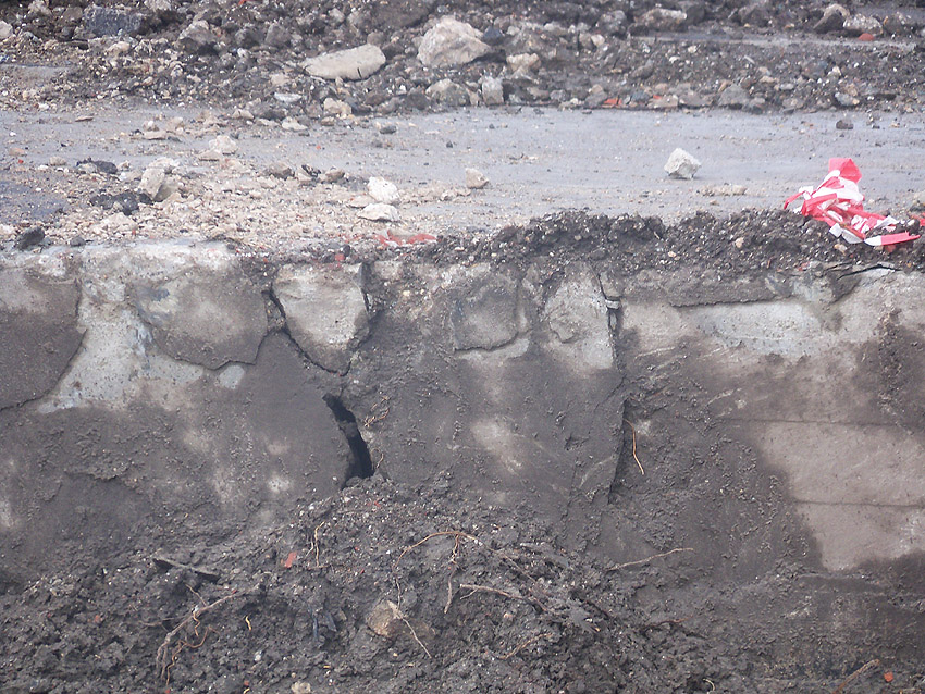 Nachtrag 14. Februar 2018 zum Objekt 2: Das westliche beider "Quadrate" bestand aus zwei nebeneinander gesetzten massiven 3,50 Meter tiefen Betonquadern (unbewehrt). Der Bereich wurde am 7., 8. und 9. Februar 2018 abgebrochen. Eventuell handelte es sich dabei um eine Art Fundament für einen Lastenkran. Vielleicht sogar um eine Art Schwerbelastungs-Testkörper?